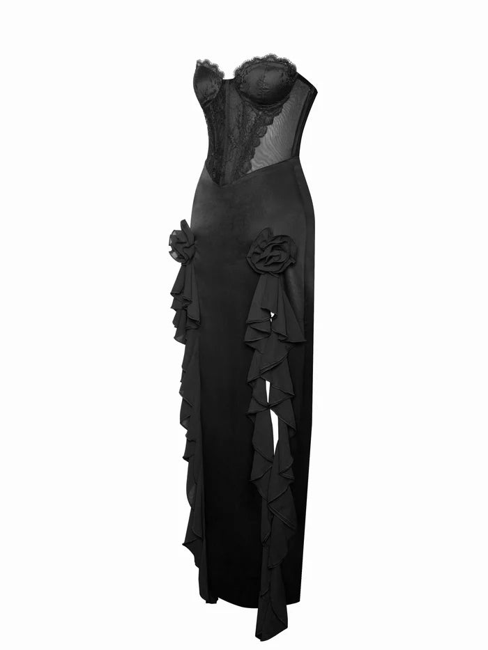 Bask in the beauty and romance. Crafted from luxe double duchess satin, this classic strapless dress features a timeless sweetheart neckline, sticky tape for added security, and supportive padded cups. Enjoy a stylish boost with the charming lace paneled corset and chiffon draped trim down the mid-thigh slits. Perfect for any special occasion. Find it in black!