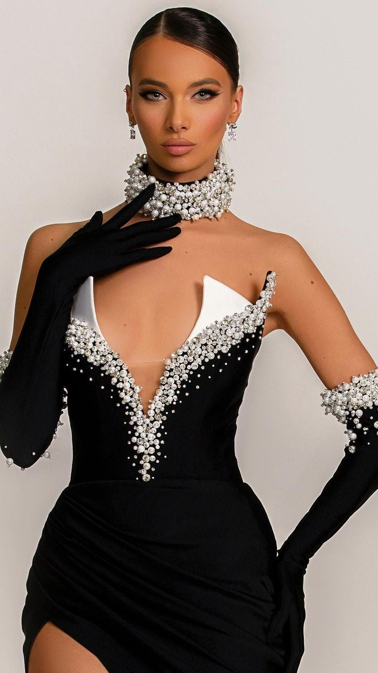 Black V-Neck Halter Half Sleeves Beadings Split Evening Dress