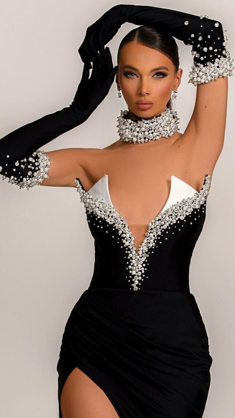The Black V - Neck Halter Half Sleeves Beadings Split Evening Dress is a masterpiece of elegance. Its V - neck and halter design exudes charm, while the half - sleeves add a touch of sophistication. The intricate beadings and the split detail bring glamour, making it ideal for special evening events.