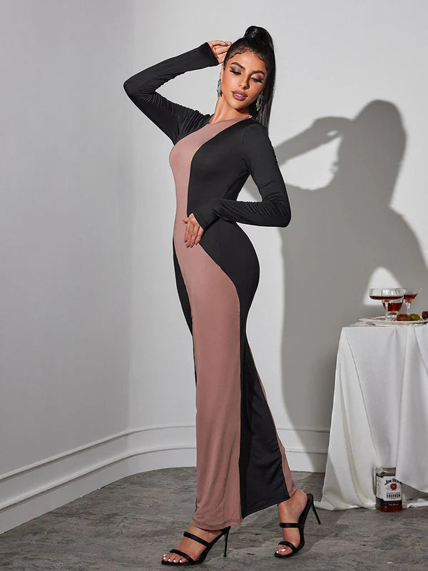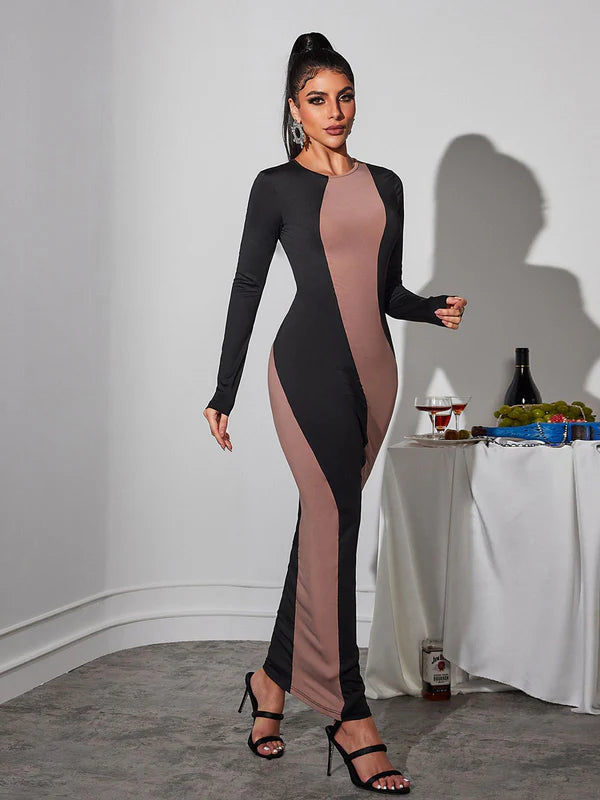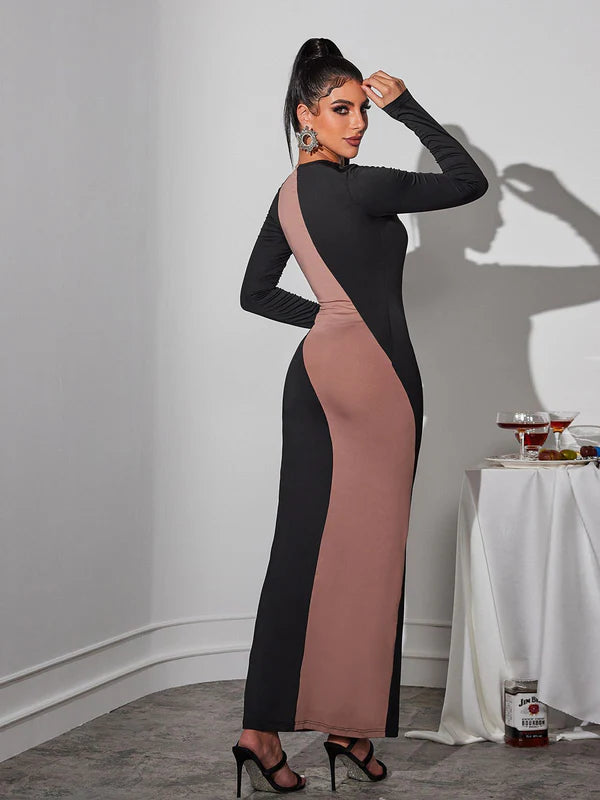 This color clashing round neck wrap dress is a bold fashion statement. Its unique color combination and wrap style add a touch of flair to your wardrobe, making it perfect for making a statement at any event.