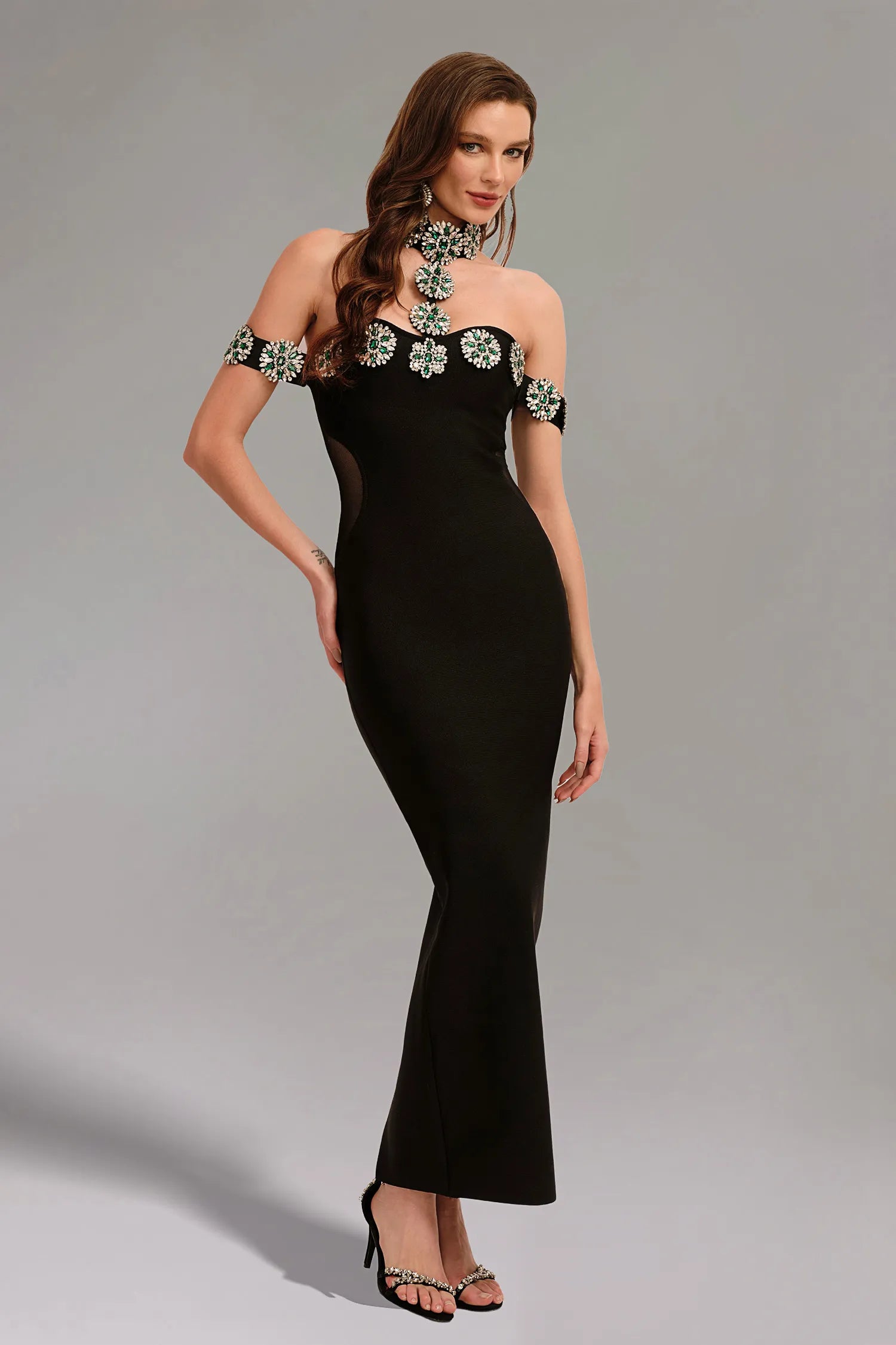 Diamond Off Shoulder Sexy Heavily Embellished One Shoulder Maxi Dress