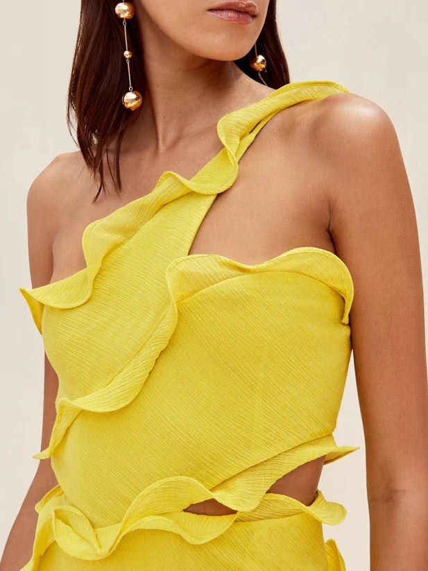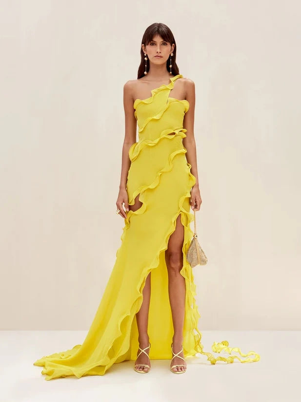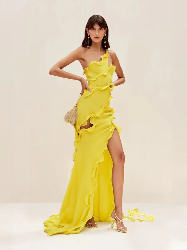 Elegant Off-One-Shoulder Ruffle Patchwork Maxi Dress is an elegant dress that twists and undulates to create undeniable appeal. It features a slim, straight fit, a long train and ruffle detailing. It is double layered but still has a touch of sheerness. Its ruffles are structured with flexible wiring for maximum effect. Its Limoncello color demands attention and matches perfectly with the golden glass bag.