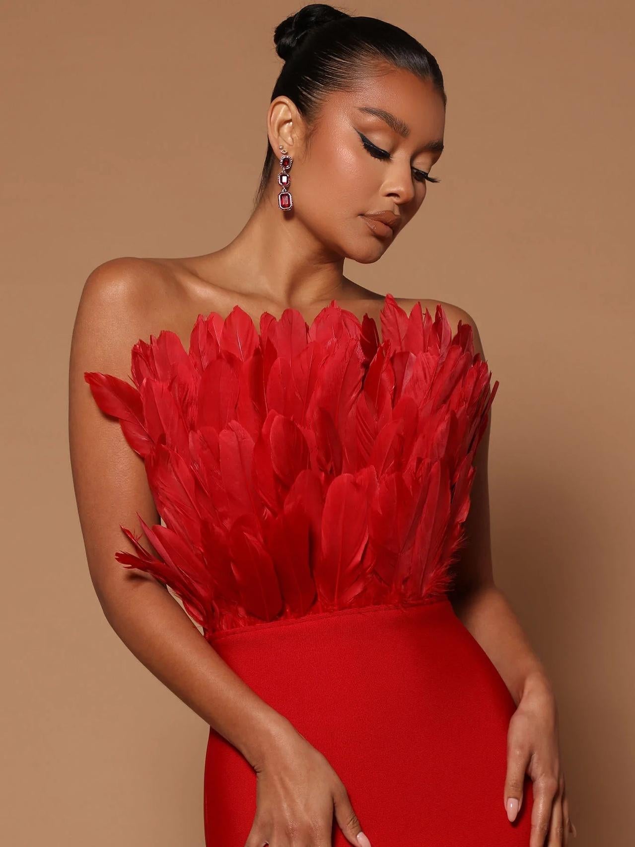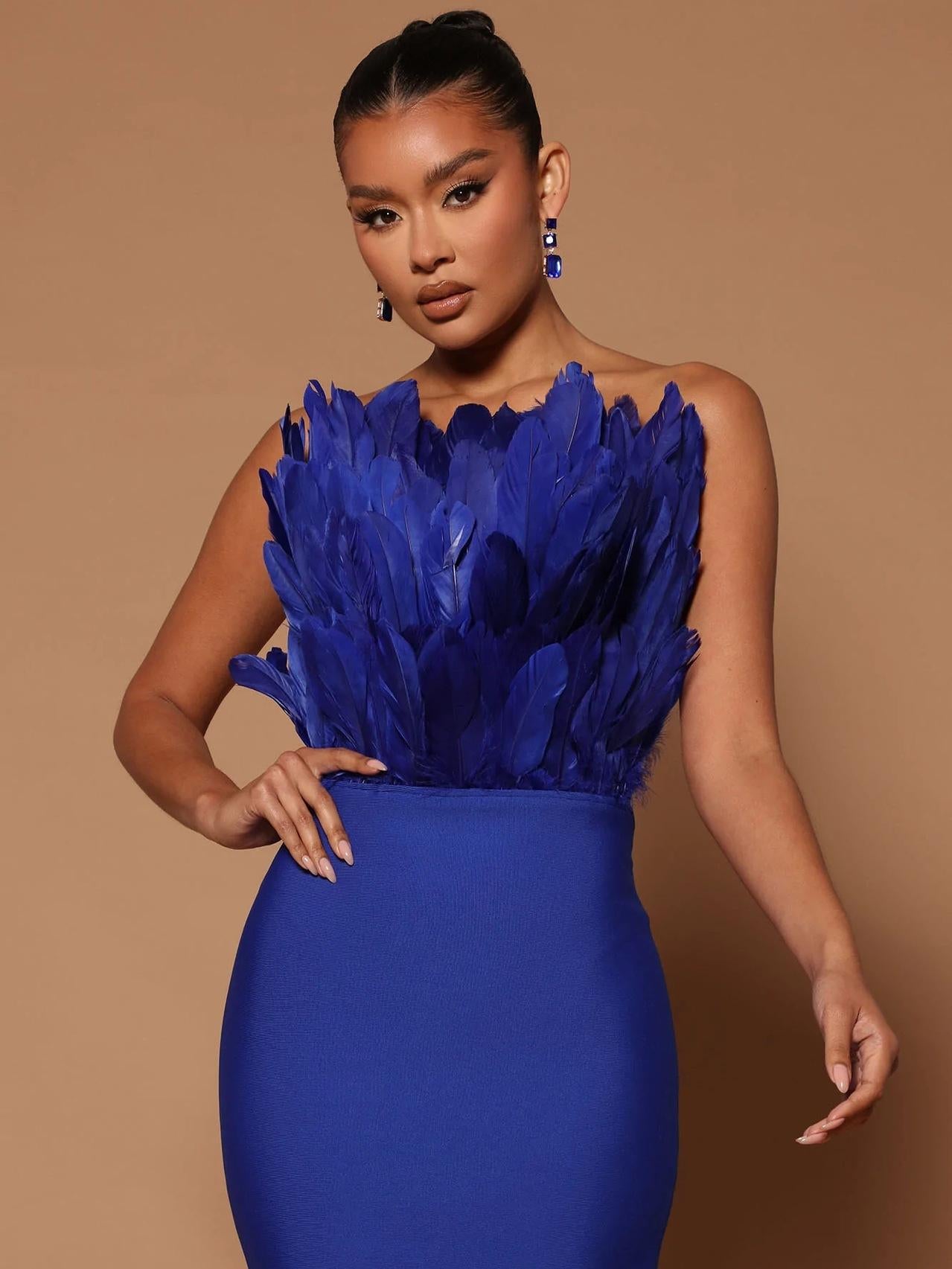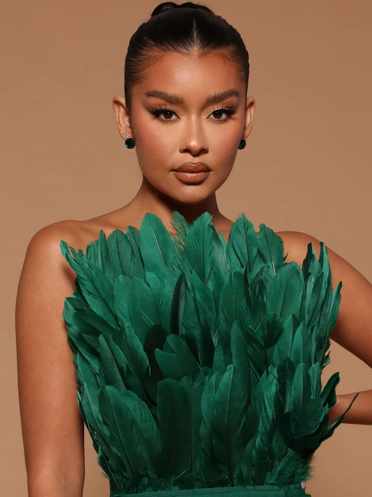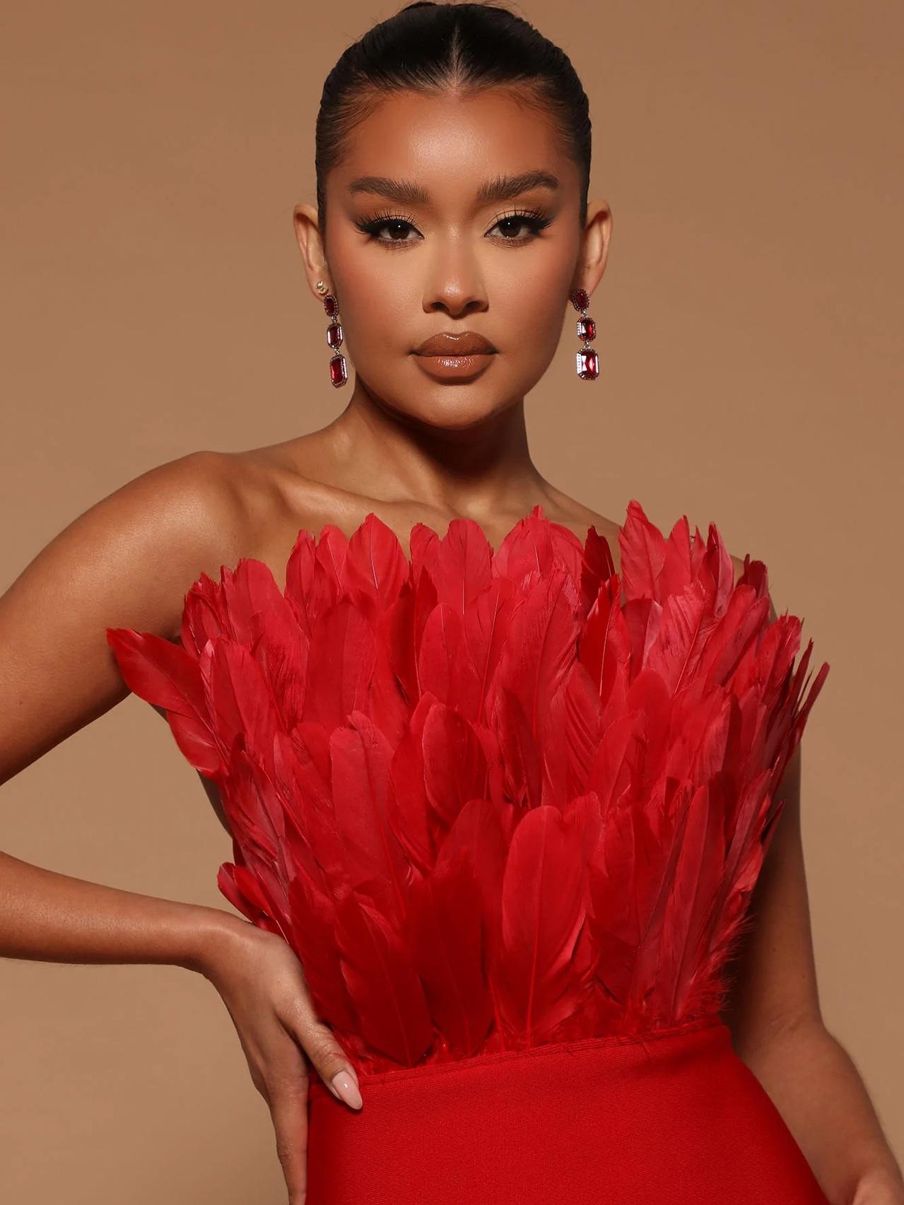 This bustier feather backless slimming mid-length bandage dress is the perfect blend of fashion and sexiness. The lightweight bandage design skillfully wraps around the figure, outlining delicate curves without losing comfort and freedom. The bustier design shows off the elegant lines of the collarbone and shoulder and neck, and the light and airy feather decoration is like angel wings gently covering the body, adding a touch of fantasy and romance.