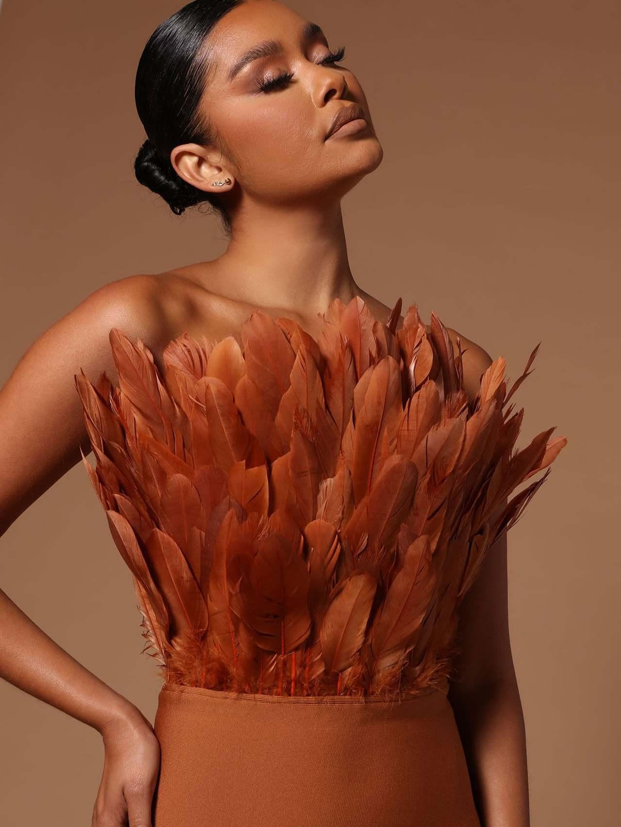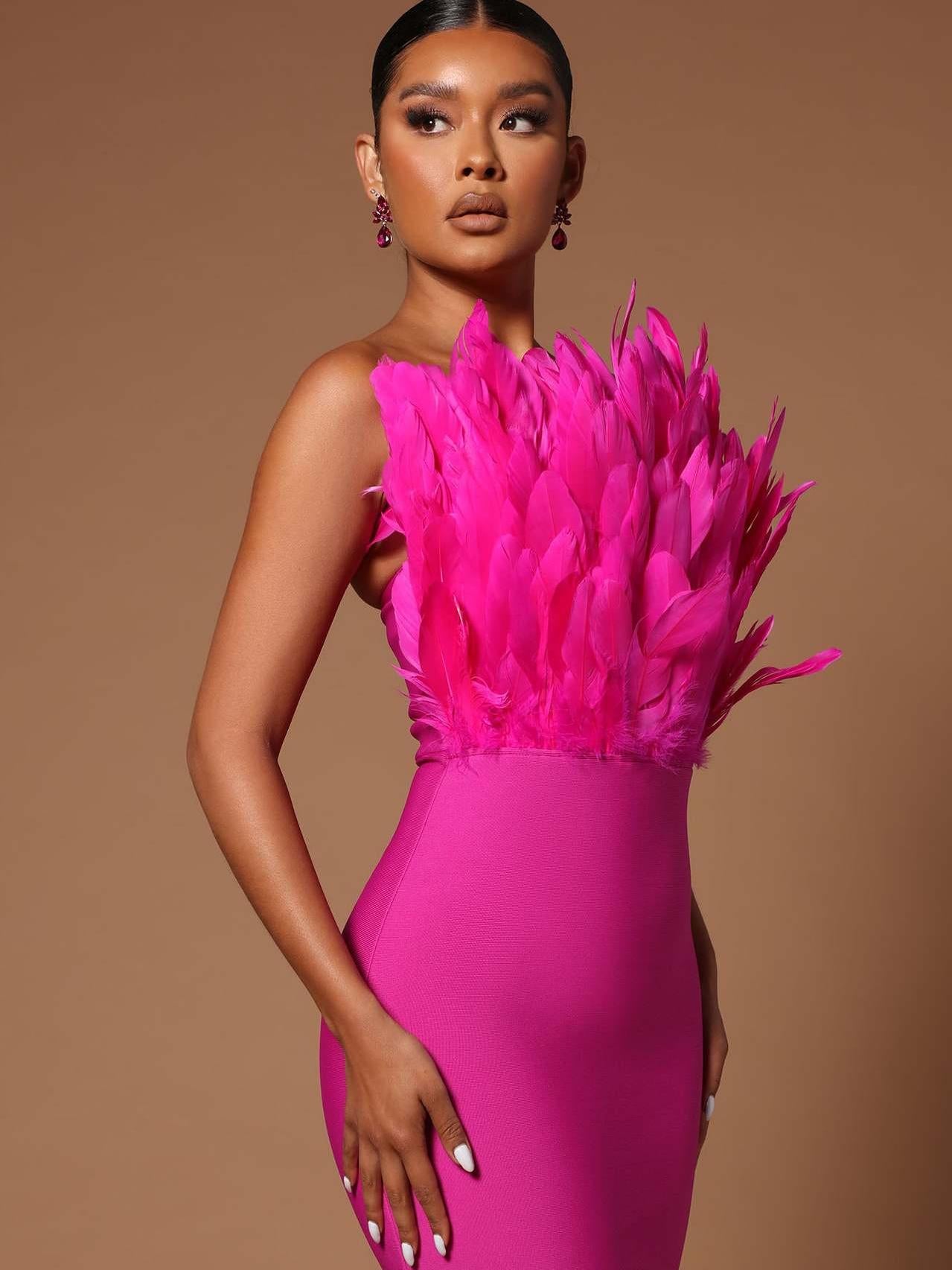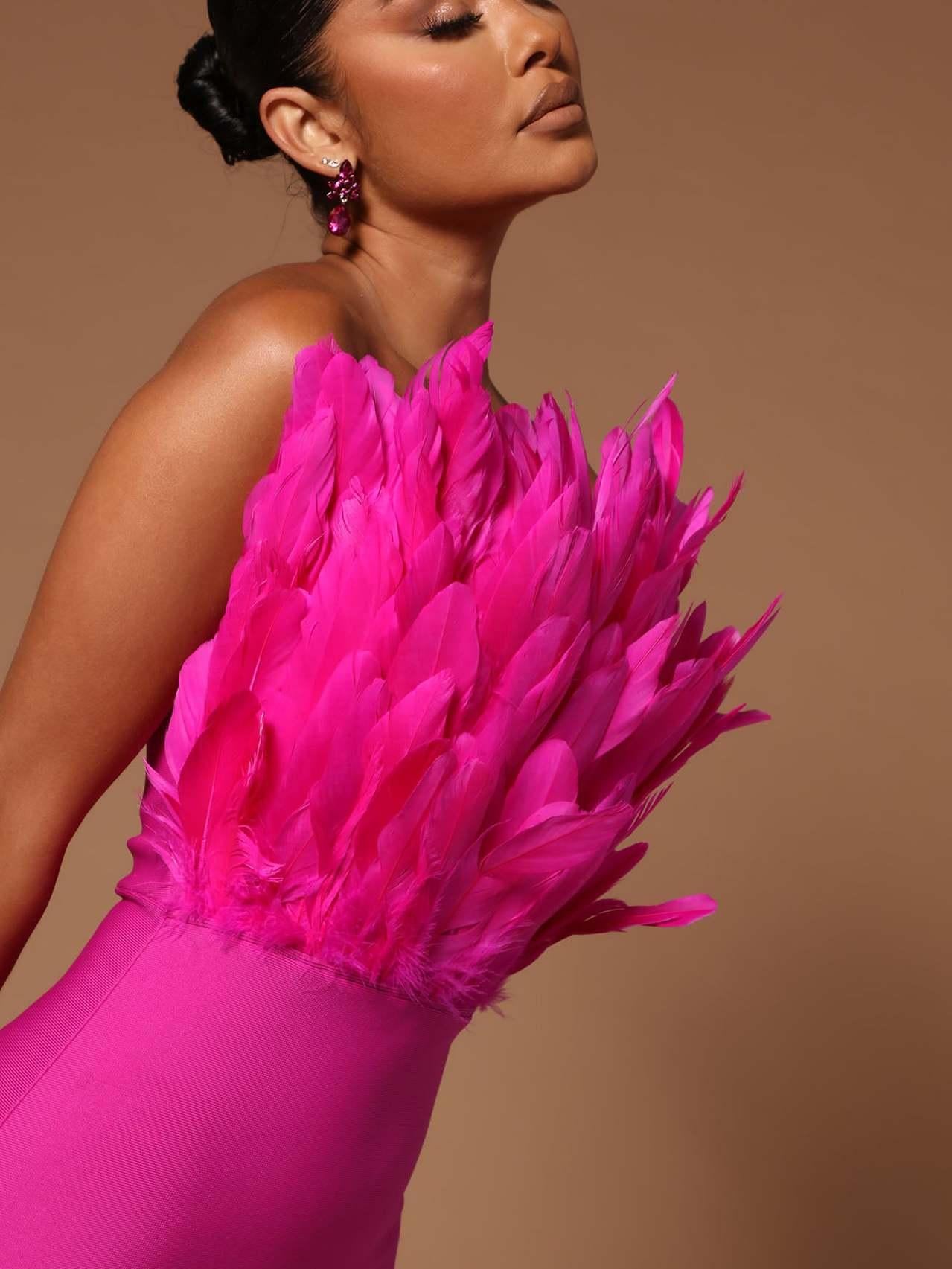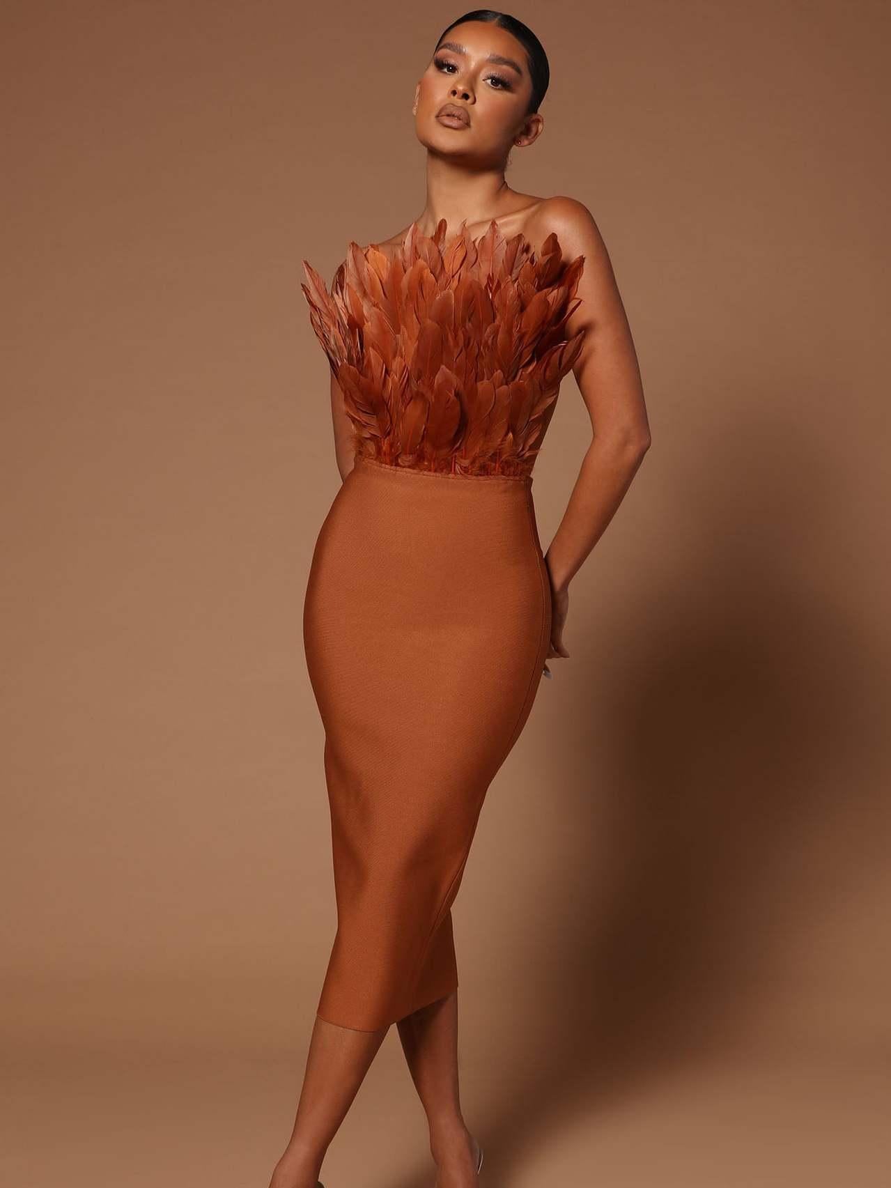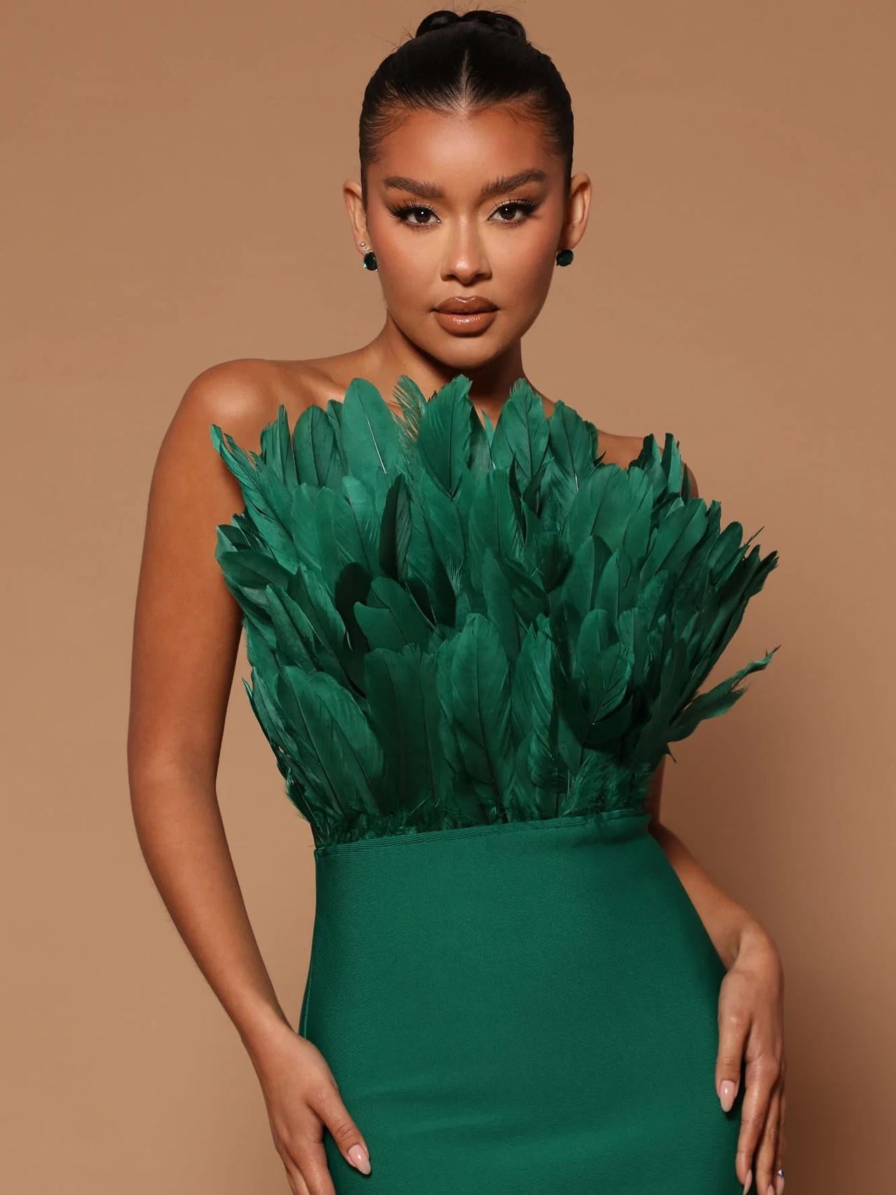 This bustier feather backless slimming mid-length bandage dress is the perfect blend of fashion and sexiness. The lightweight bandage design skillfully wraps around the figure, outlining delicate curves without losing comfort and freedom. The bustier design shows off the elegant lines of the collarbone and shoulder and neck, and the light and airy feather decoration is like angel wings gently covering the body, adding a touch of fantasy and romance.