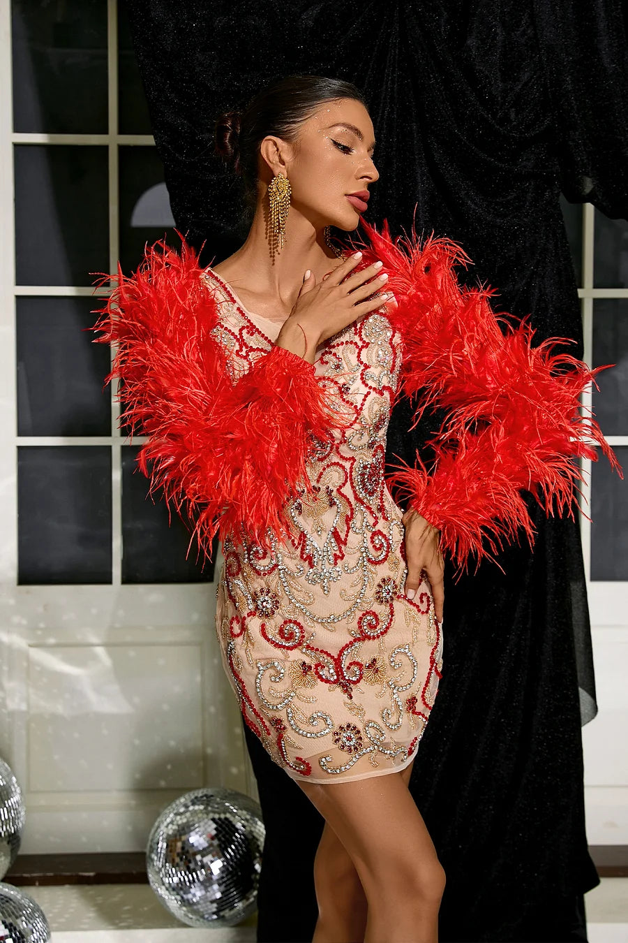 The feather sleeves are unique and the feathers are light and soft, giving a dreamy feel and adding a spiritual beauty. Visually striking, it brings a romantic and elegant atmosphere. The diamonds are distributed in key areas, such as the neckline, cuffs or chest, to provide the finishing touch. The tightness of the body perfectly defines the curves of the figure, while also conveying a sense of style and modernity.