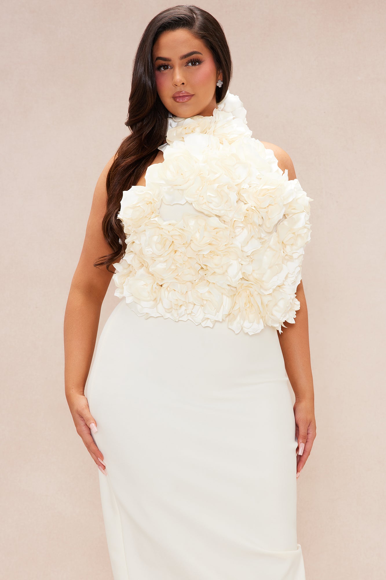 The halterneck top features eye - catching 3D floral embellishments in a vivid color, adding a sense of drama. Paired with a form - fitting pencil skirt in the same bold shade, it flatters the figure. Ideal for special events, it combines fashion and elegance.