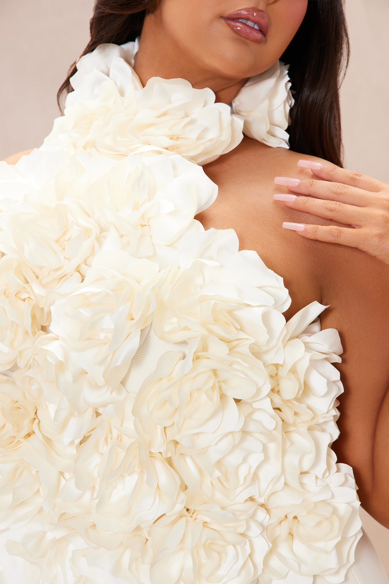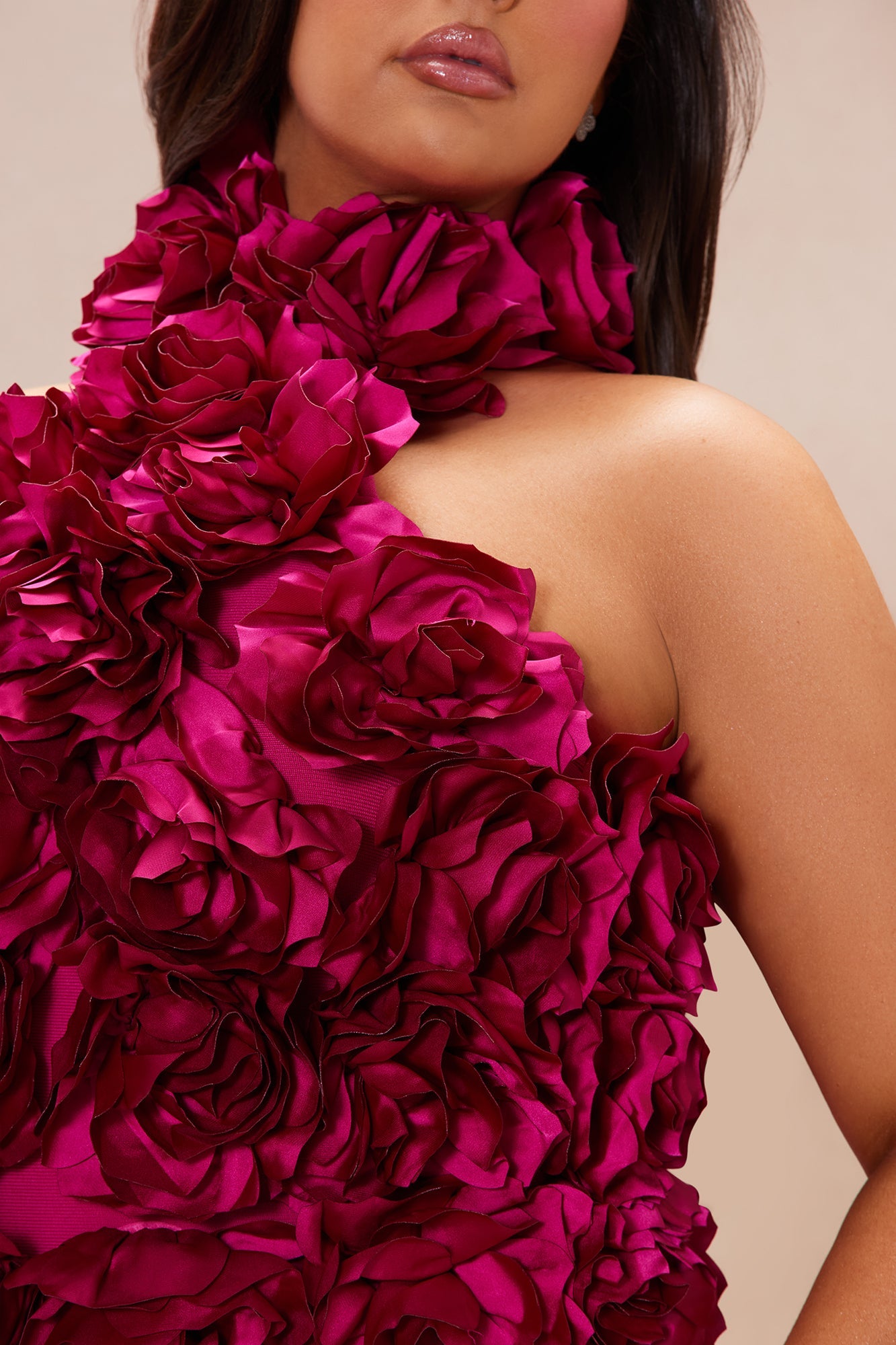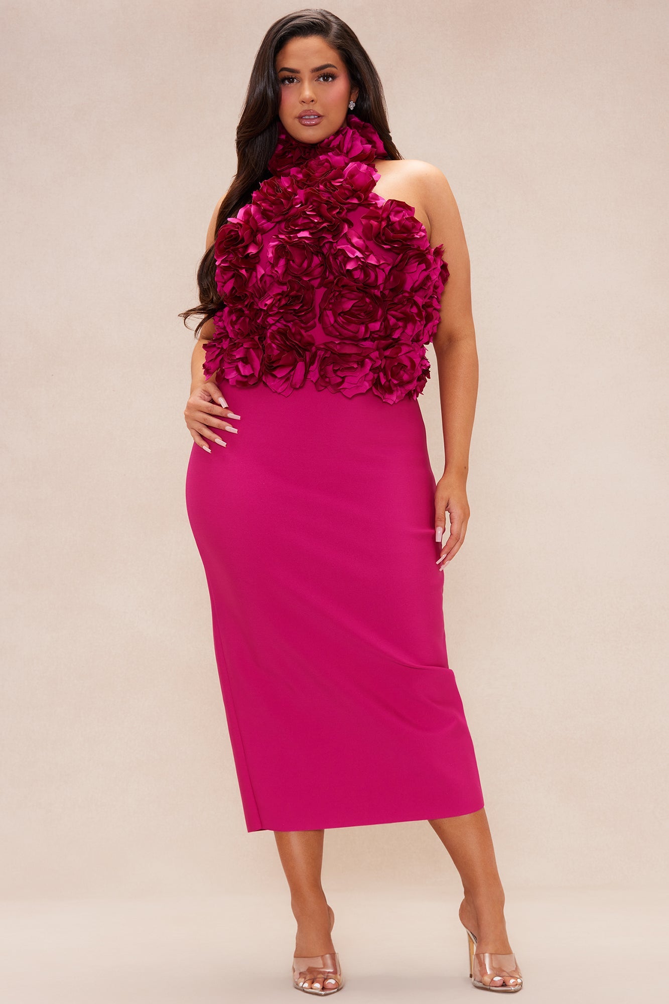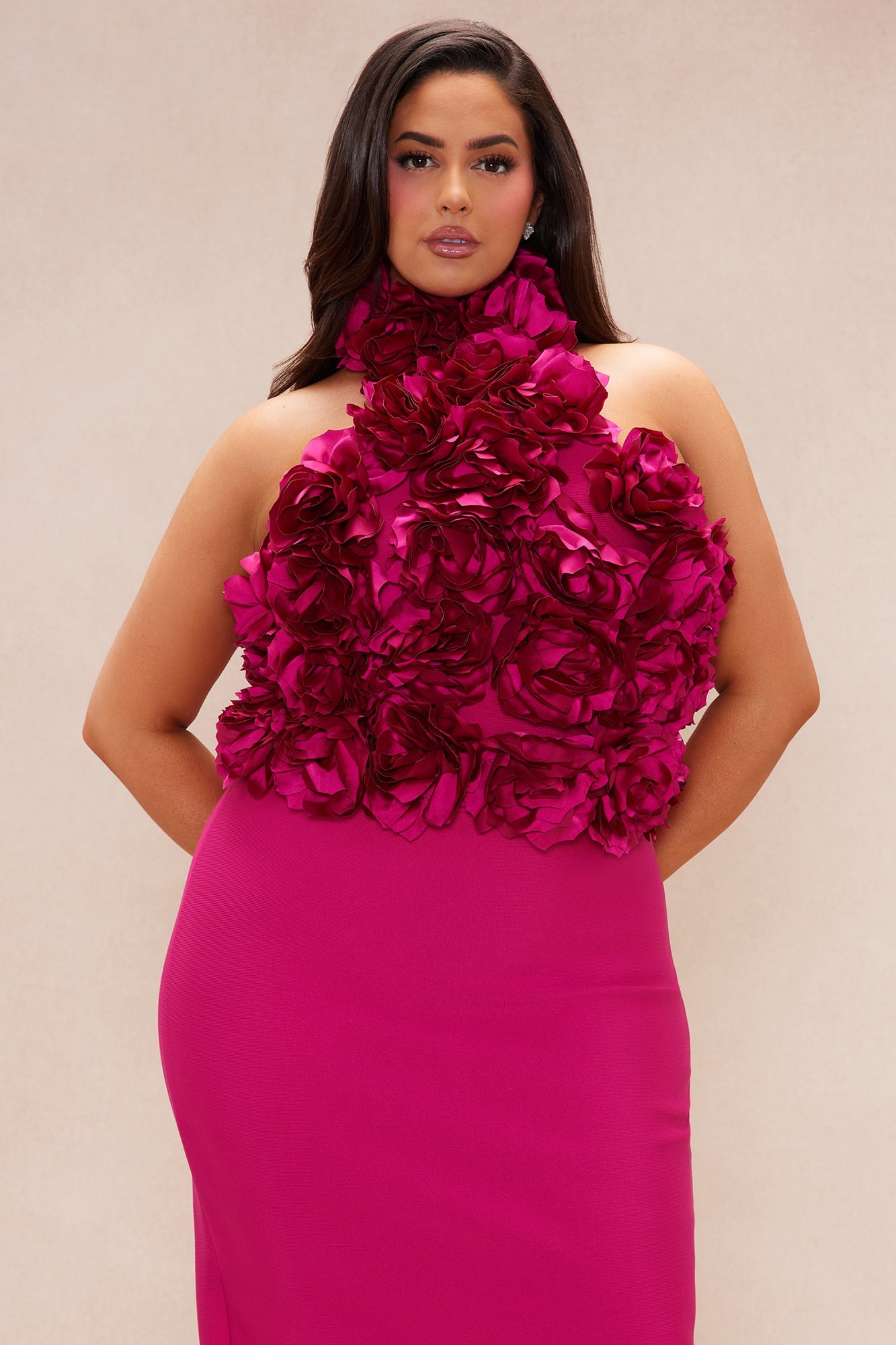 Fuchsia Halterneck Dress with 3D Floral Accents and Pencil Skirt