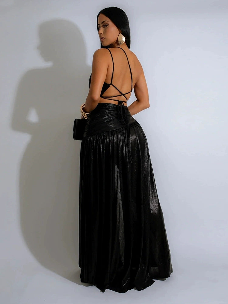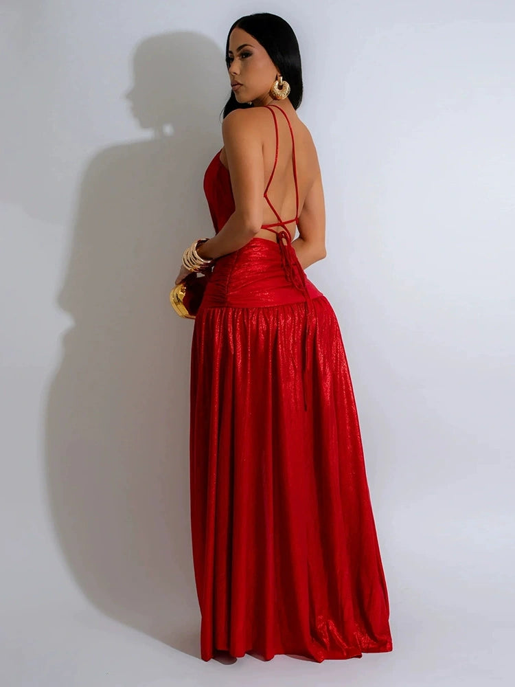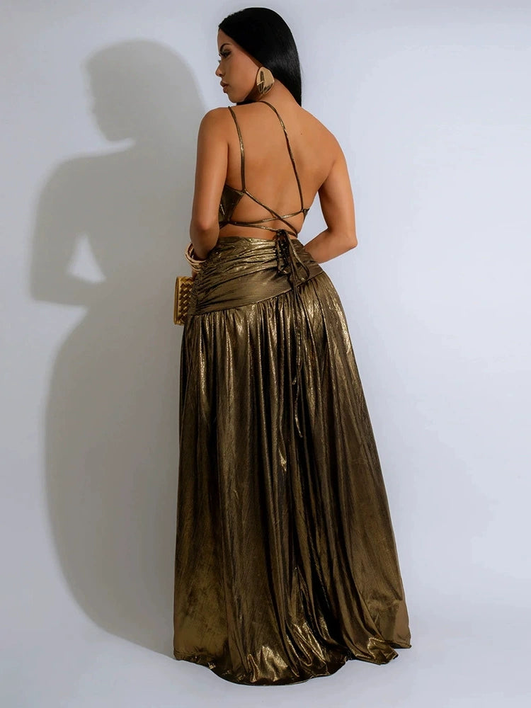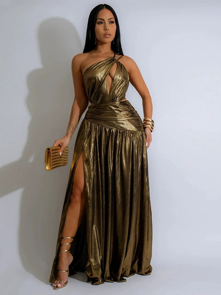 The Glamorous Choice Gold Metallic Long Dress is an absolute showstopper. This exquisite dress is crafted in a radiant gold metallic fabric that catches the light beautifully, ensuring you'll shine and sparkle with every step. The long length adds an element of elegance and sophistication, making it perfect for formal events, galas, or any occasion where you want to make a grand entrance.