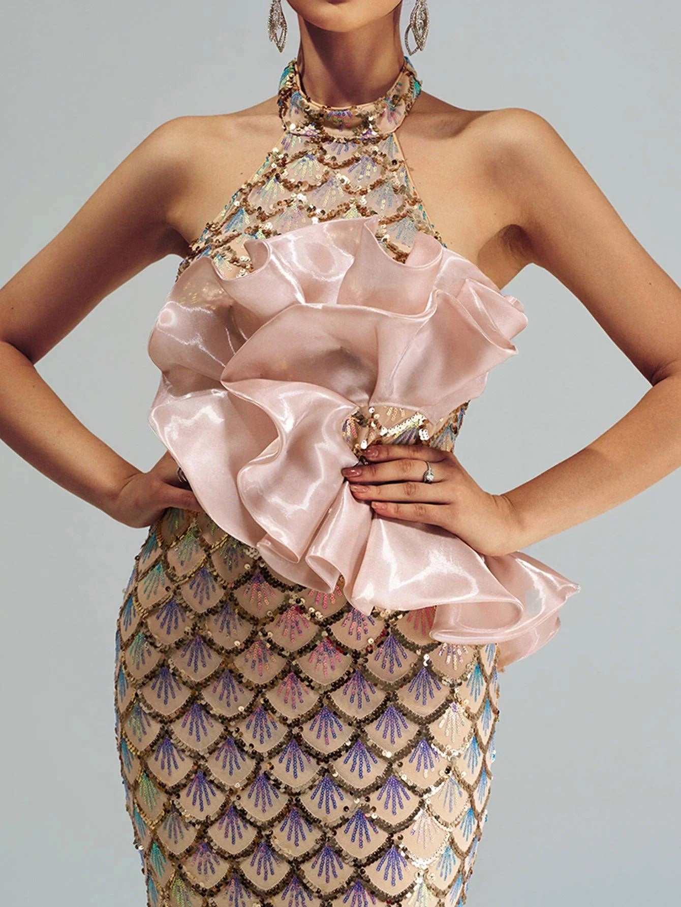 This Halter Floral Mermaid Sequin Evening Dress is a dazzling choice for special occasions. The halter neckline elegantly frames the shoulders and neck. Adorned with exquisite floral patterns, it adds a touch of romance. The mermaid silhouette hugs the body gracefully, creating a flattering shape. Sparkling sequins cover the dress, catching the light from every angle, ensuring you'll be the center of attention. Ideal for galas, proms, or formal events, it combines style and glamour in one stunning piece.