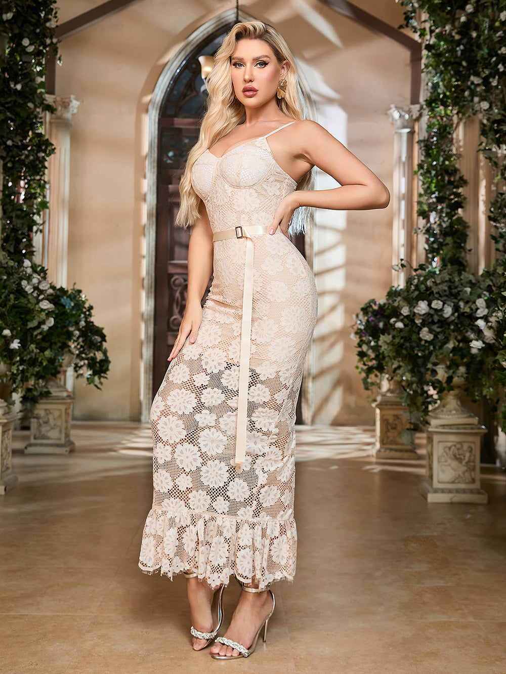 This stunning halter lace dress features a cubic flower design on the back, culminating in a graceful split. It hugs curves beautifully, offering a unique and flirty silhouette for a memorable night out.