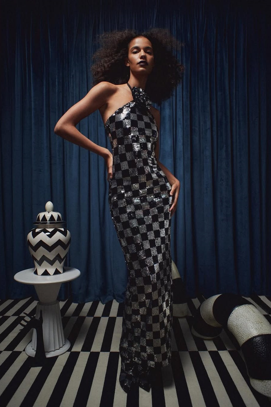 This Halter Neck Sequin Checkered Maxi Dress Gown is a dazzling choice for special occasions. The dress is adorned with a striking black - and - silver checkered pattern made up of sequins, which catches and reflects light, ensuring the wearer stands out. Its floor - length silhouette flows gracefully, making it perfect for galas, evening parties, or high - profile events where a bold and glamorous statement is desired.