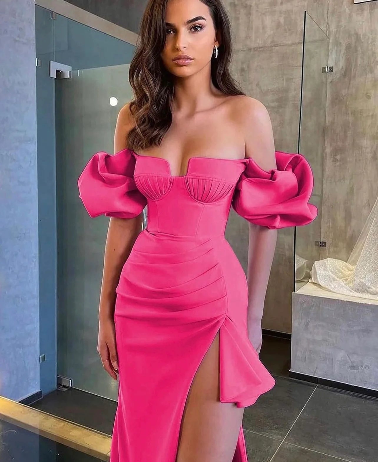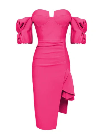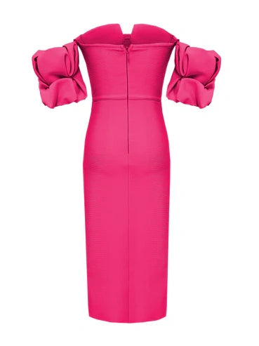 Elevate your wardrobe with this stunning Off-Shoulder Deep V Bandage Dress. Featuring elegant lantern sleeves and a daring side slit, this dress combines sophistication with a touch of allure. Perfect for special occasions, it hugs your curves while ensuring comfort and style. Make a statement and turn heads wherever you go!