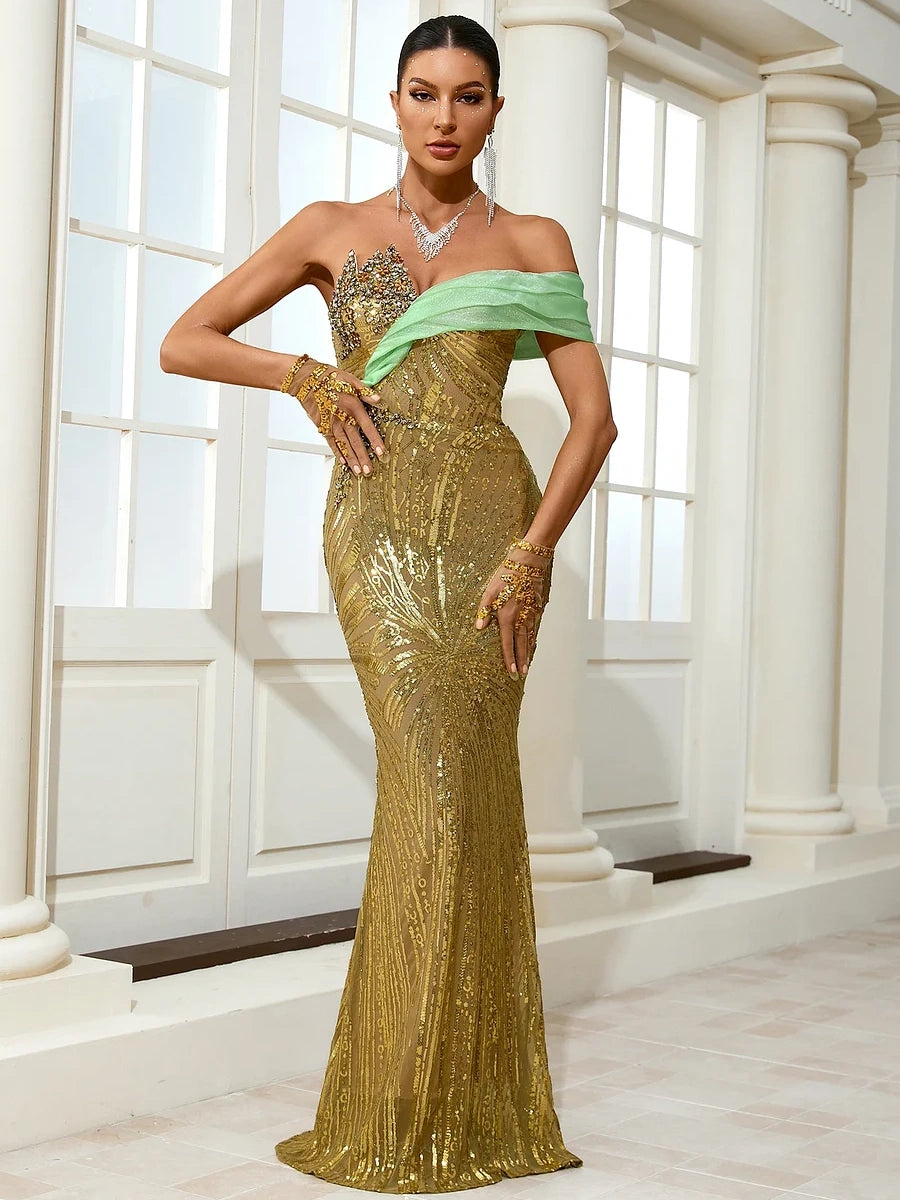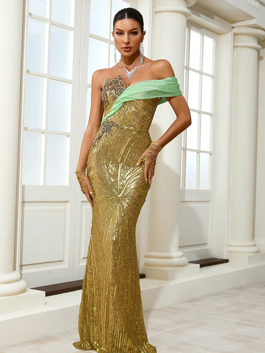 The one-shoulder diamond maxi dress exudes elegance and sophistication. With its asymmetrical neckline and stunning diamond embellishments, this dress highlights your shoulders and adds a touch of sparkle. The flowing silhouette drapes beautifully, making it perfect for formal events or upscale occasions where you want to make a glamorous impression.
