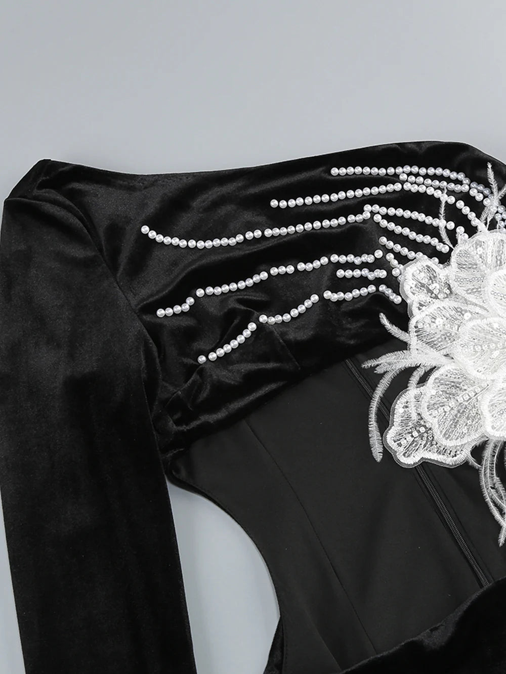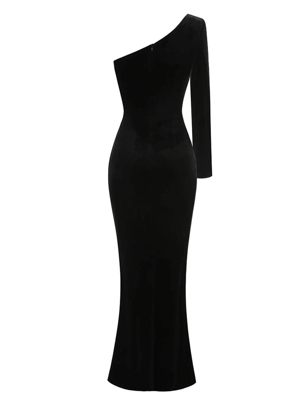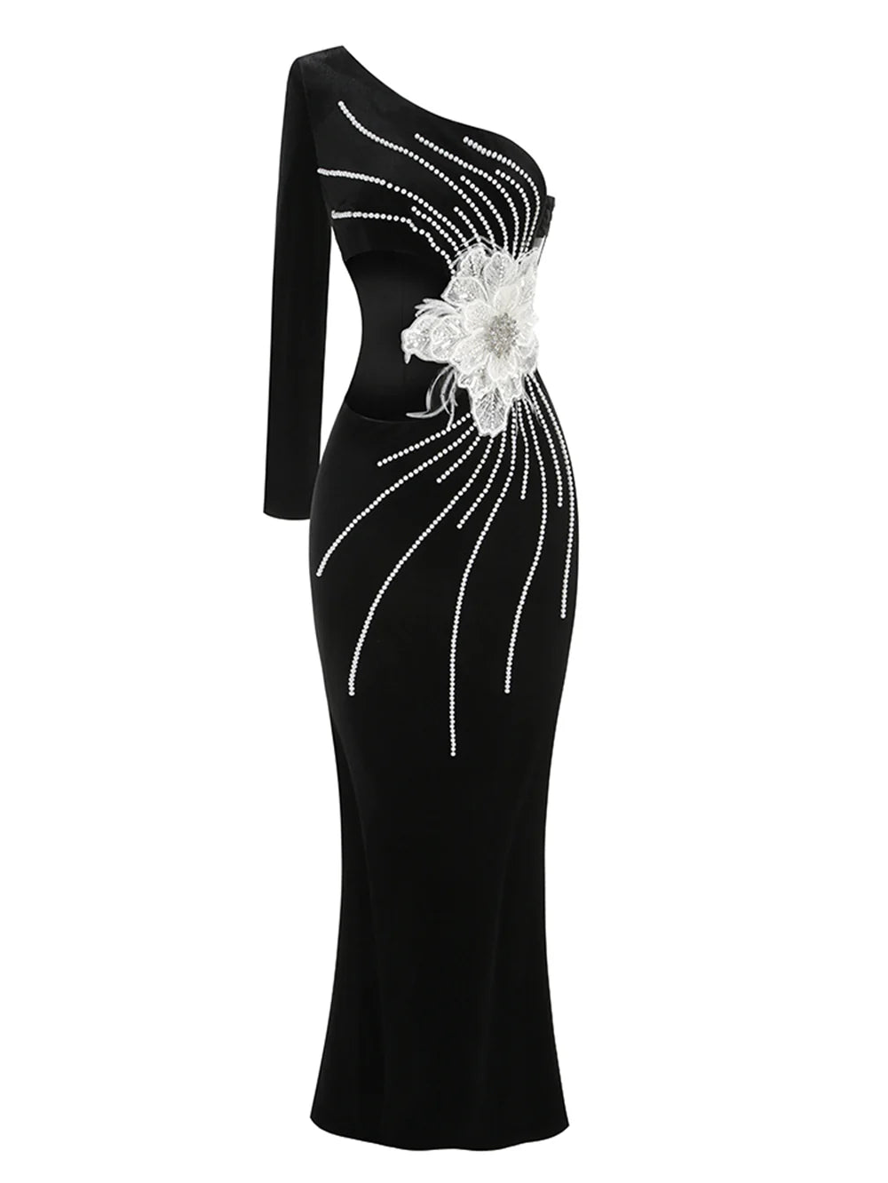 One Shoulder Long Sleeve 3D Flower Maxi Dress