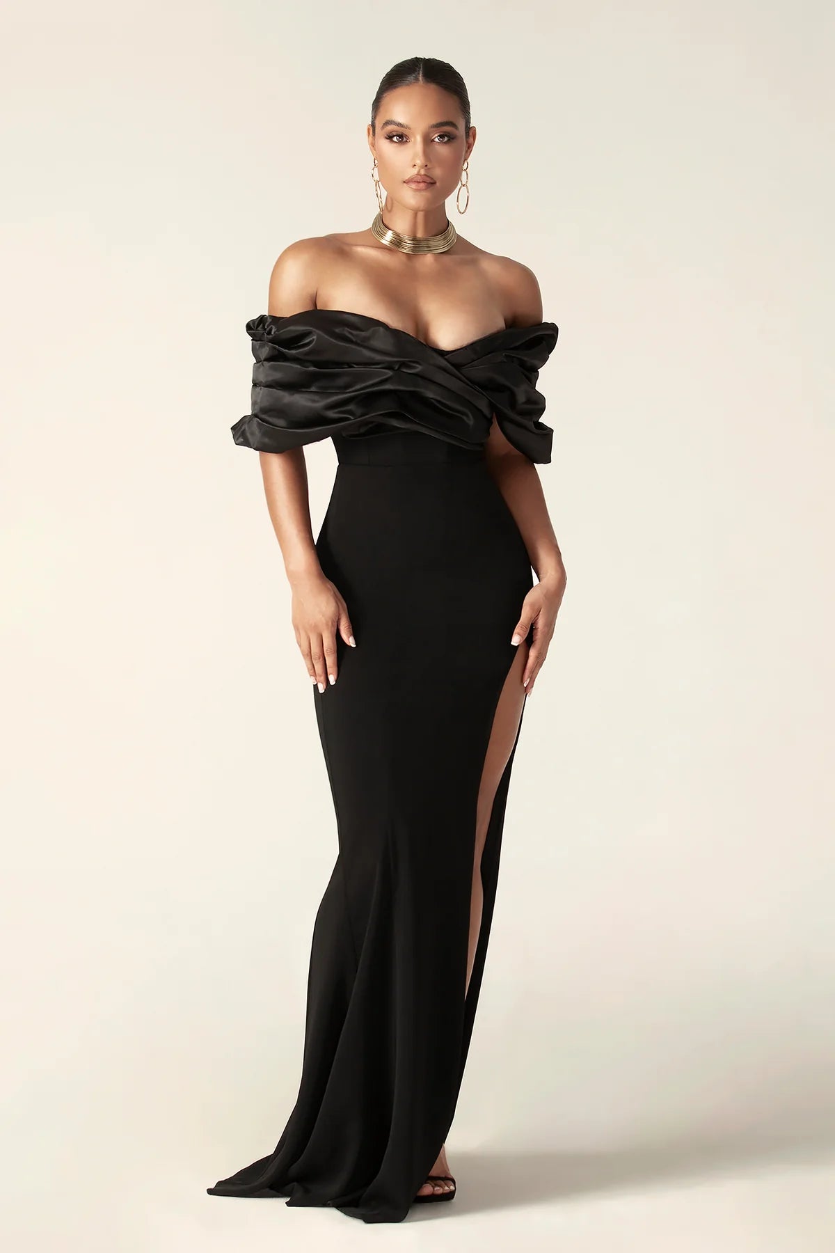 Presley Crepe Ruffle Shoulder Gown Dress (Black)