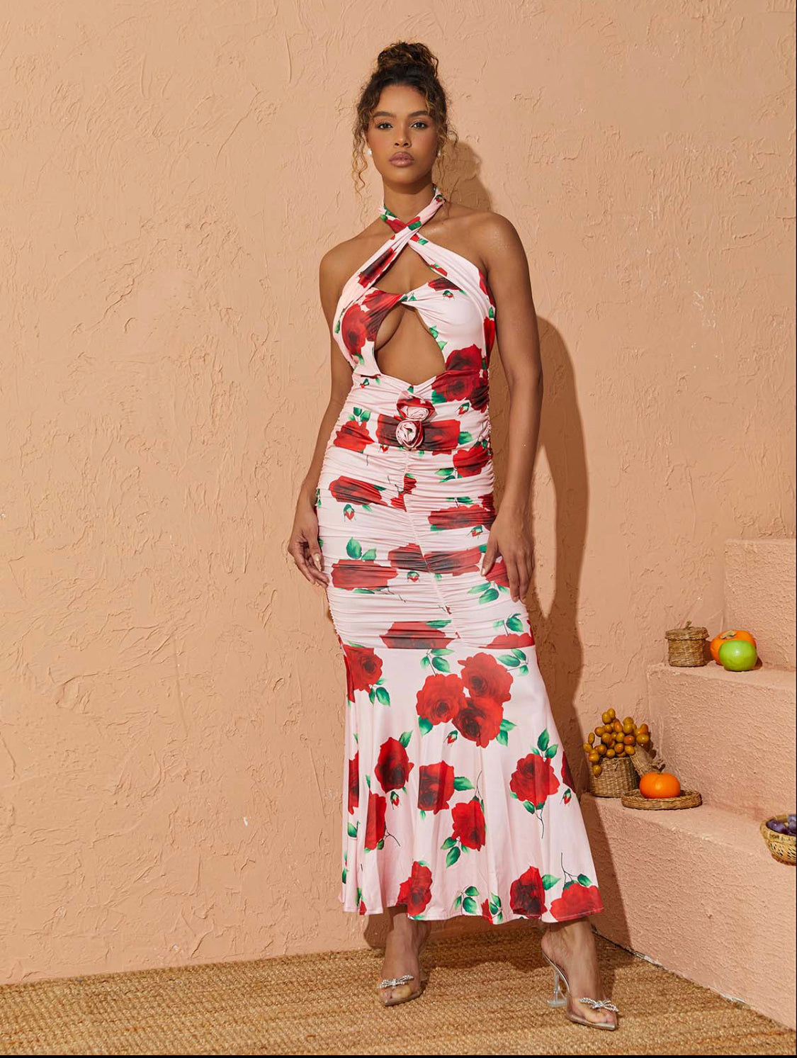 This printed pleated ruffle maxi dress showcases playful elegance with its vibrant prints and flowing silhouette. The pleated design creates movement, while ruffle accents add a feminine touch. Ideal for summer gatherings, weddings, or garden parties, this dress ensures you stand out with effortless charm and style.