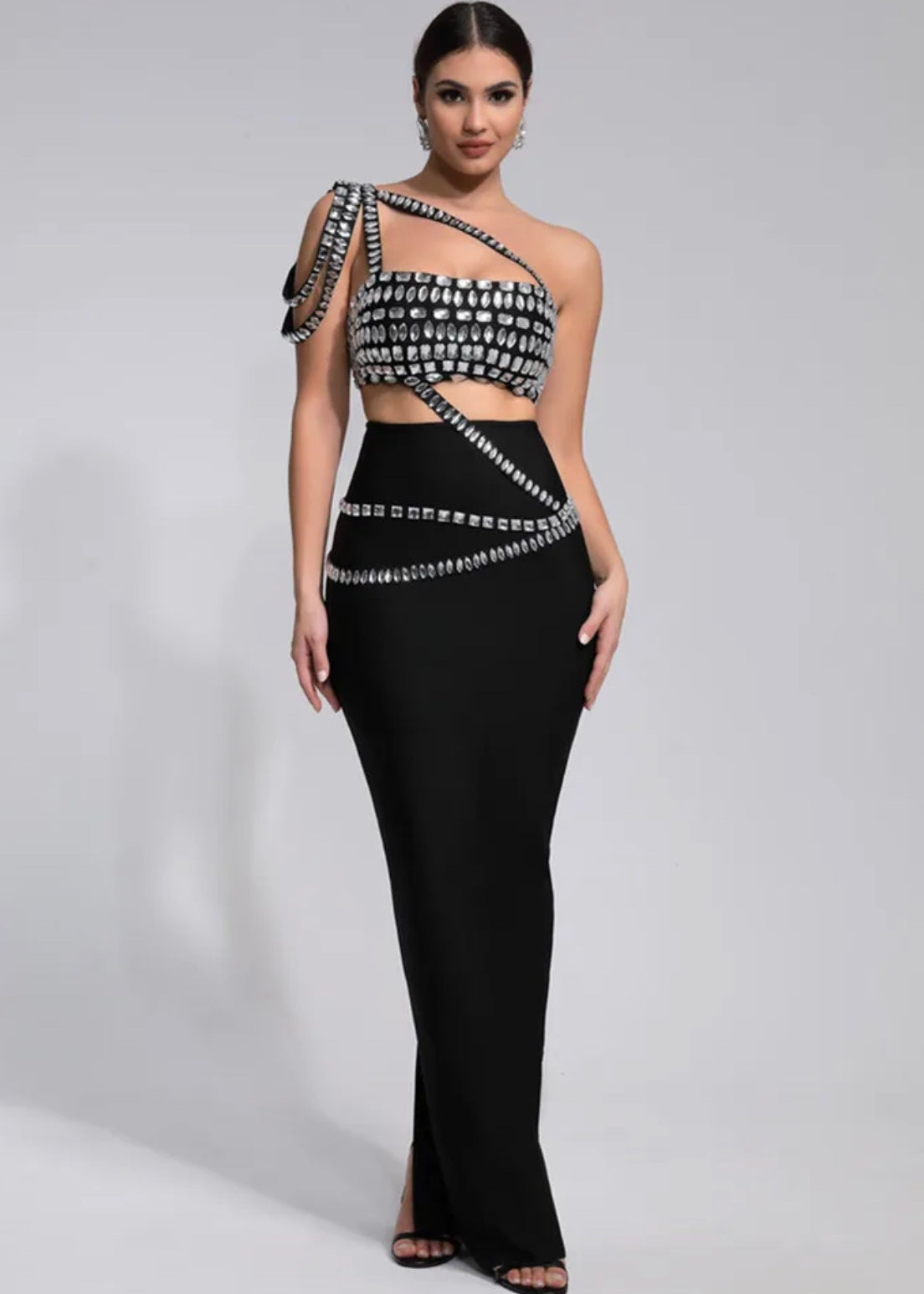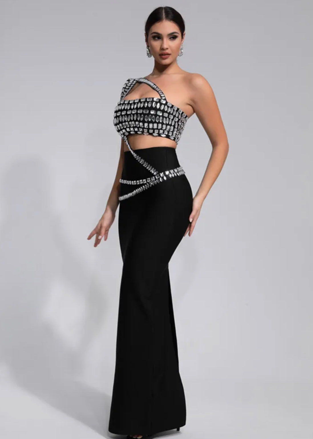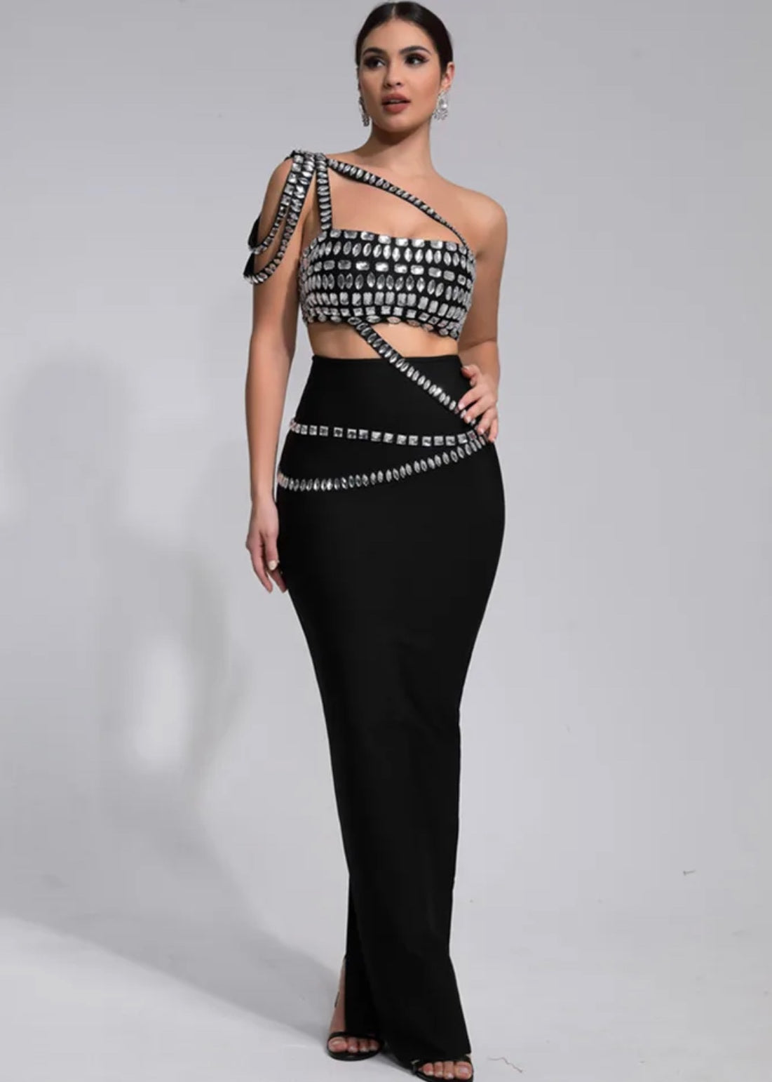 Experience alamour and elegance with our Rhinestone Draping shoulder Two-piece Dres.The black bodvcon desion hugs your curves while the moxi lenth adds atouch of sophistication, The sprking hinestone detaiing on the shoulders adds a touch of luxury to this stylish ensemble. Perect for special occasions, this dress wilmake you stand out and feel confident.