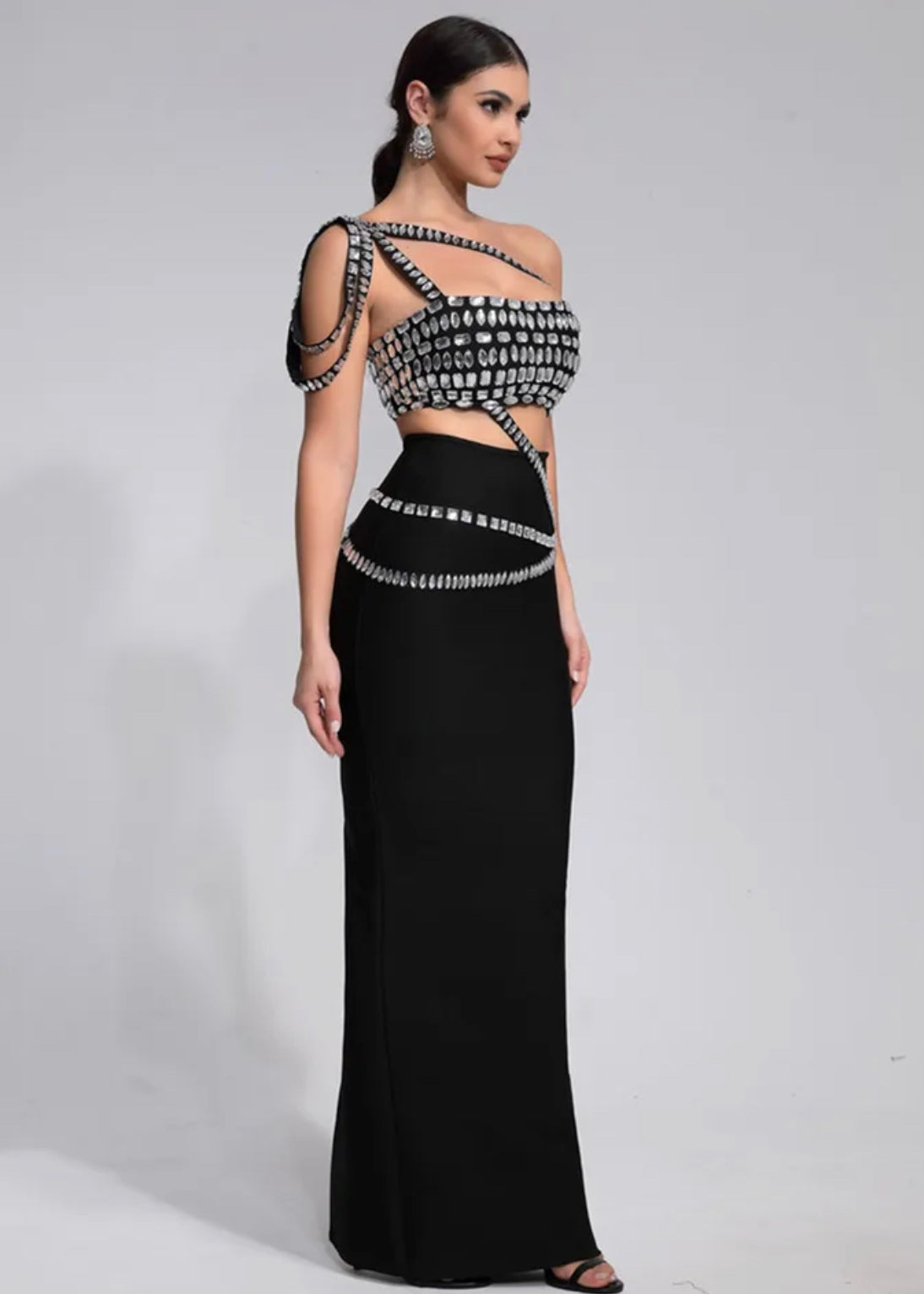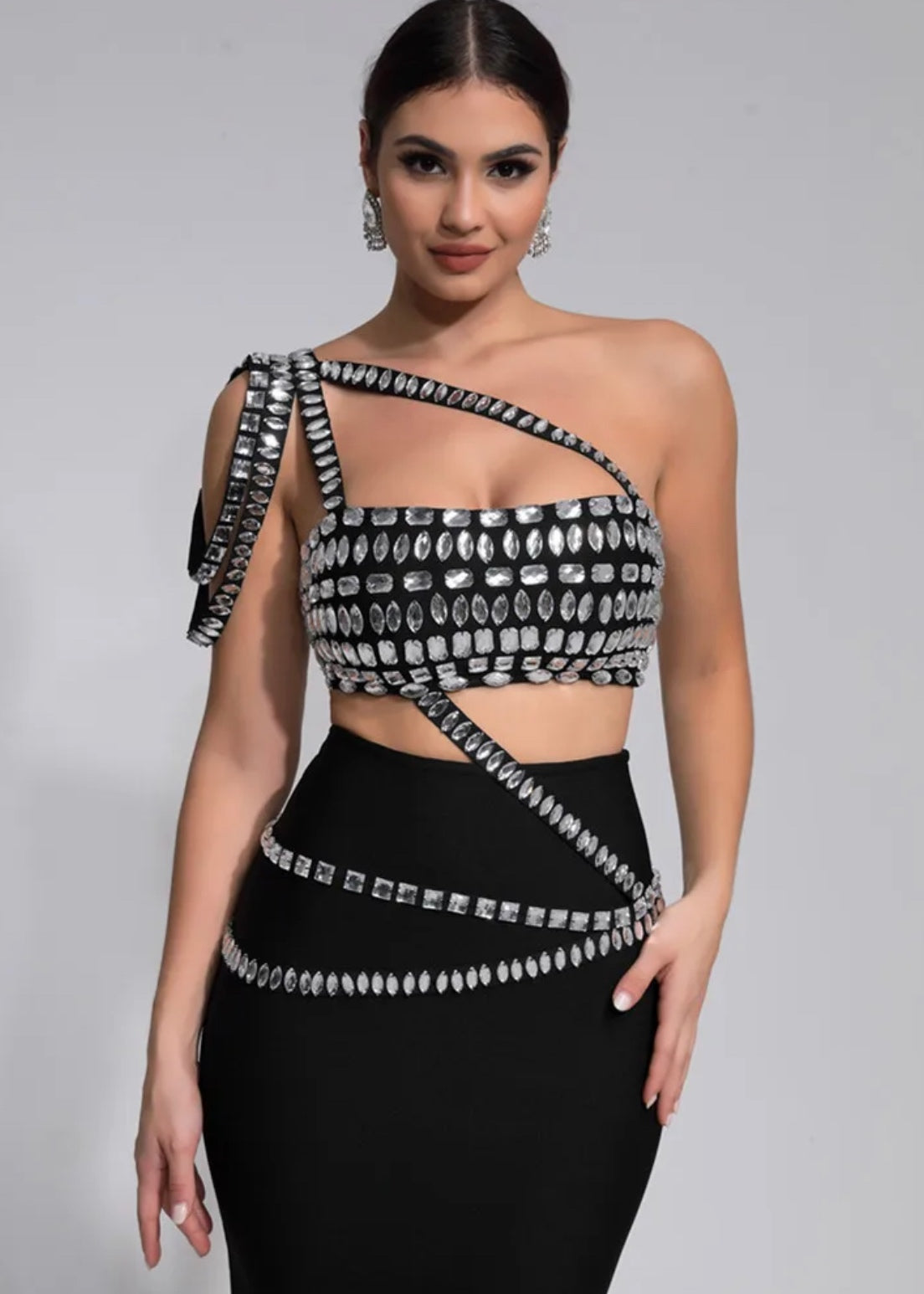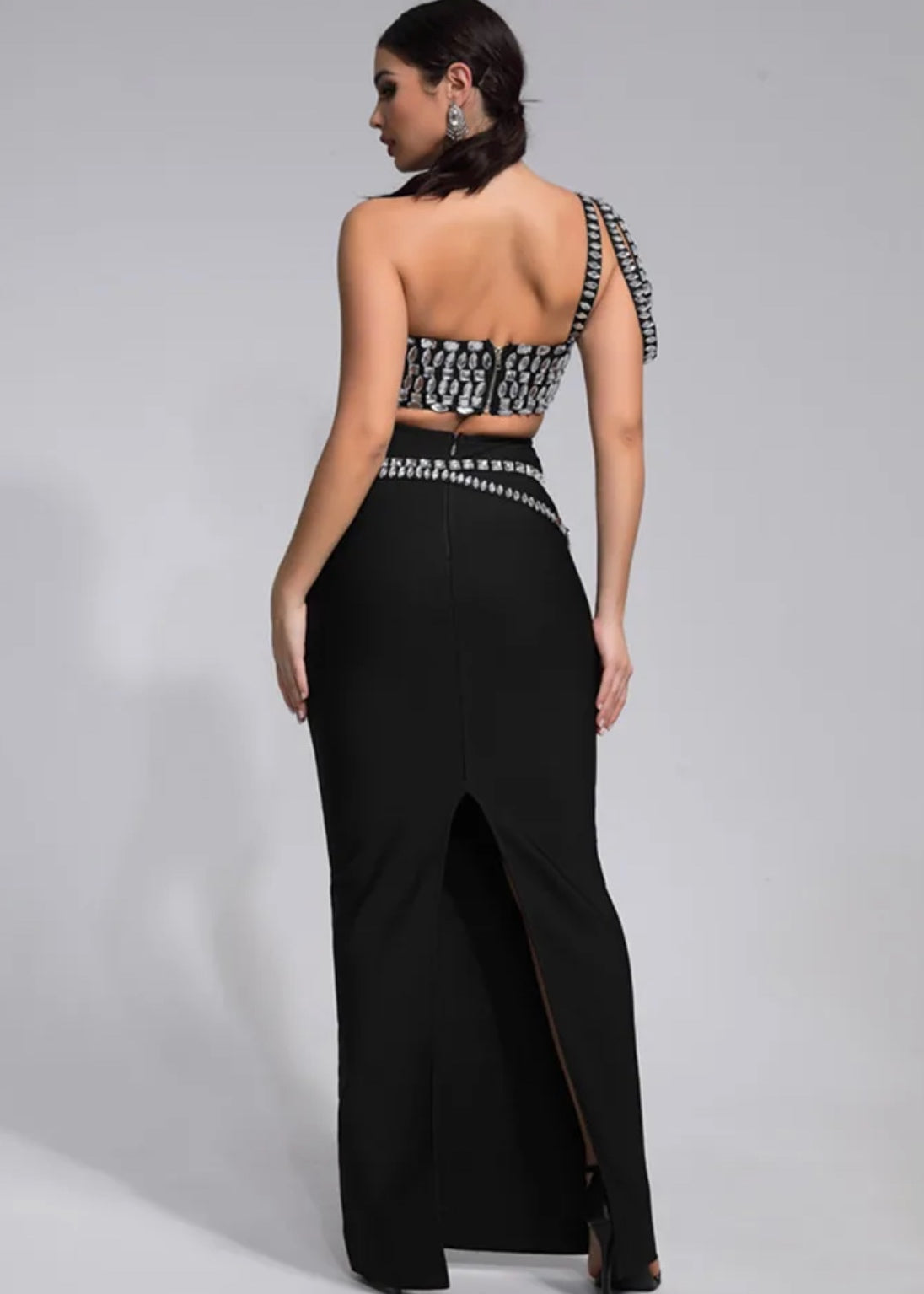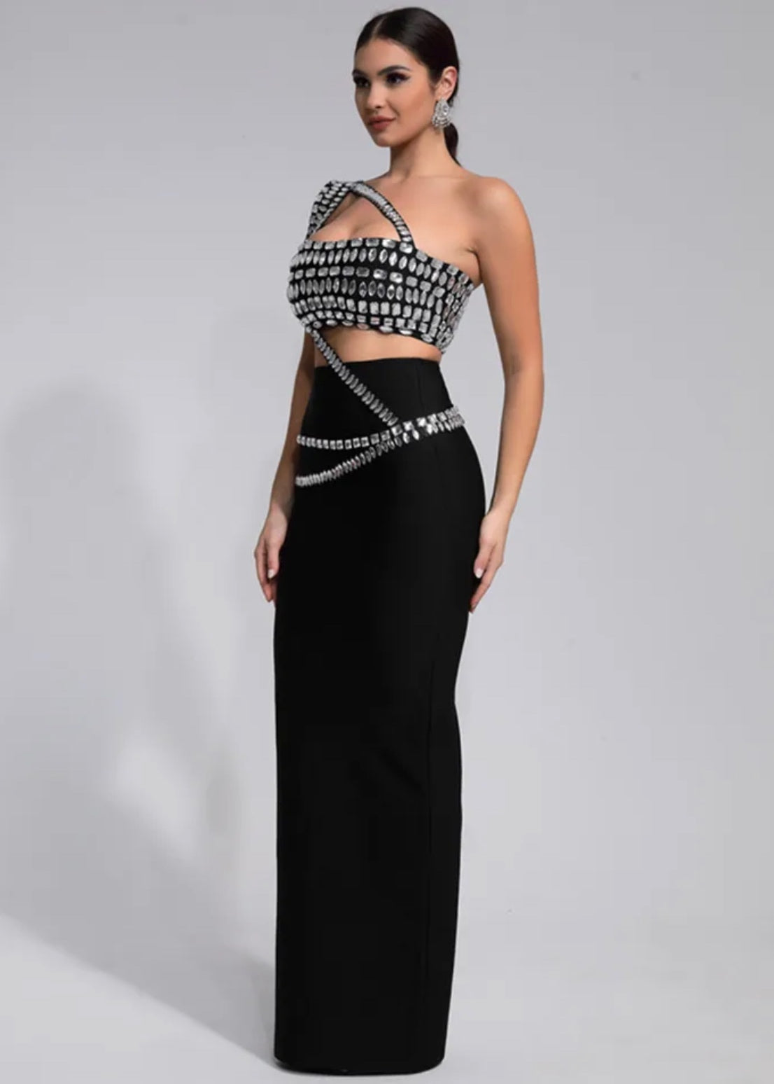 Experience alamour and elegance with our Rhinestone Draping shoulder Two-piece Dres.The black bodvcon desion hugs your curves while the moxi lenth adds atouch of sophistication, The sprking hinestone detaiing on the shoulders adds a touch of luxury to this stylish ensemble. Perect for special occasions, this dress wilmake you stand out and feel confident.