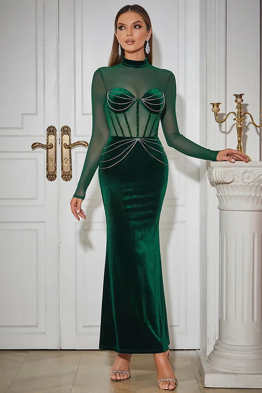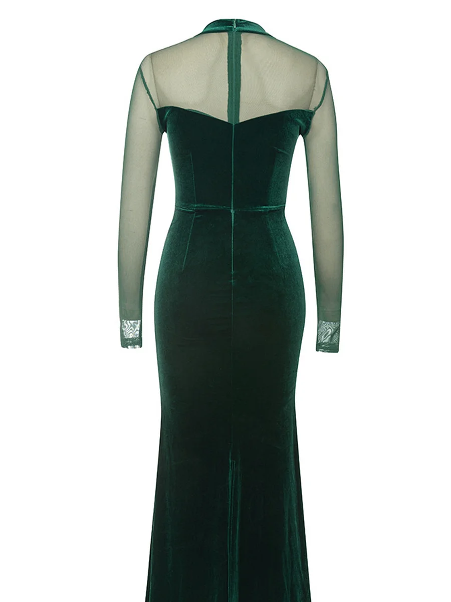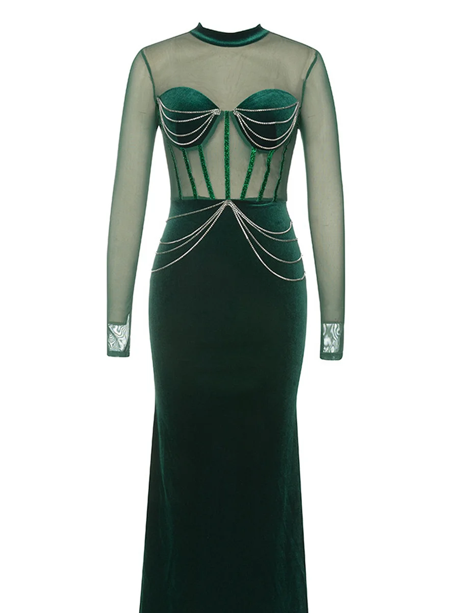 Round Neck Patchwork Mesh Sleeve Velvet Drill Chain Dress
