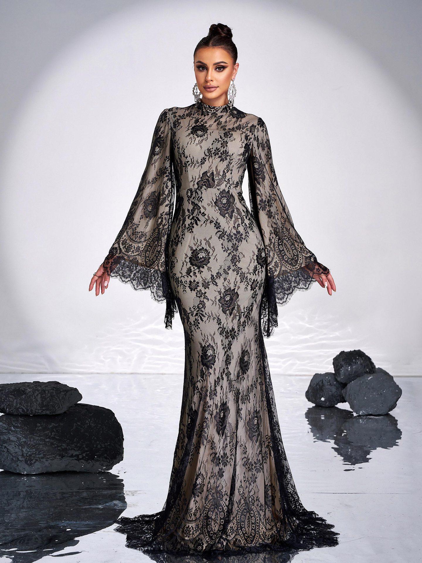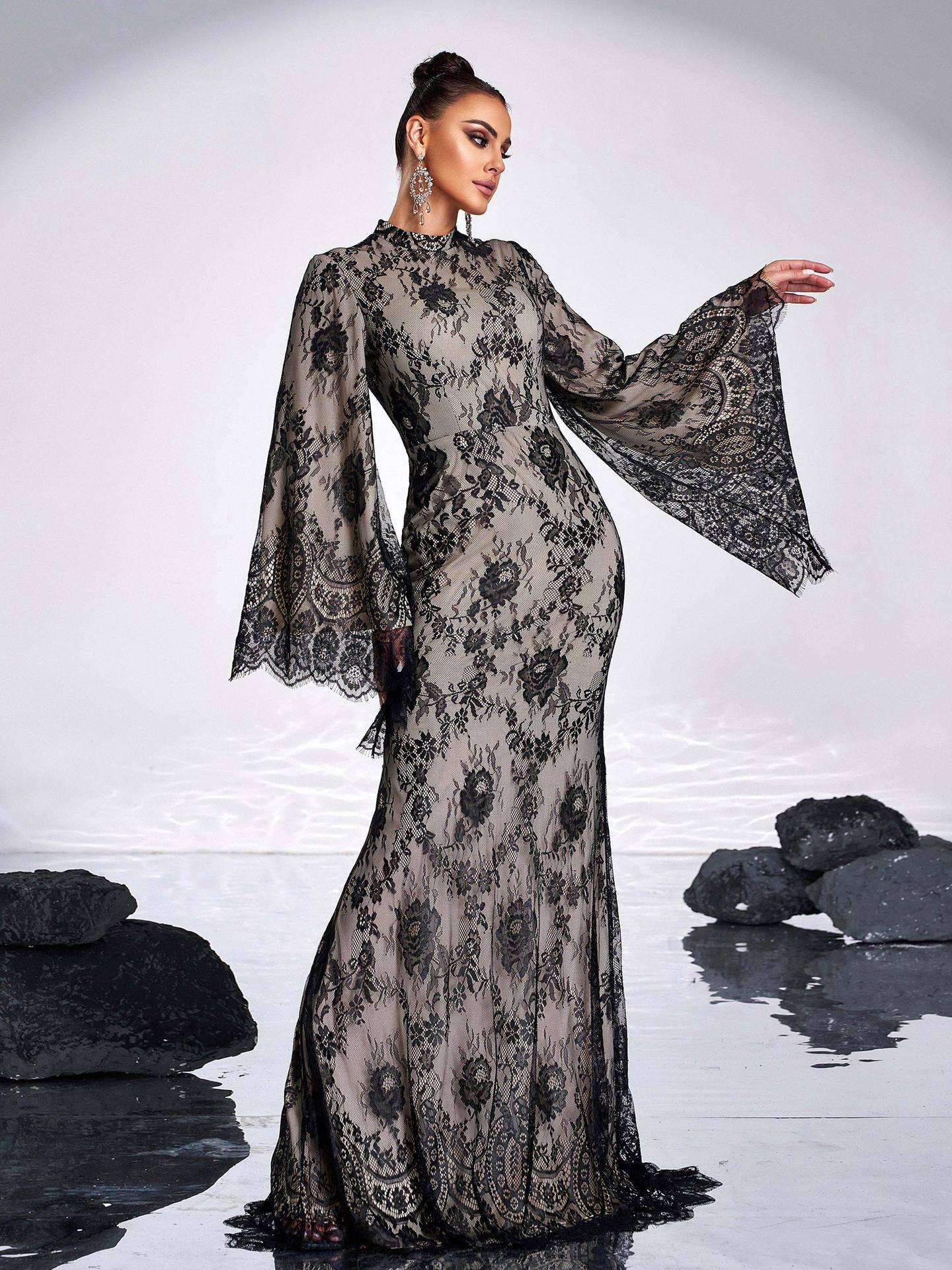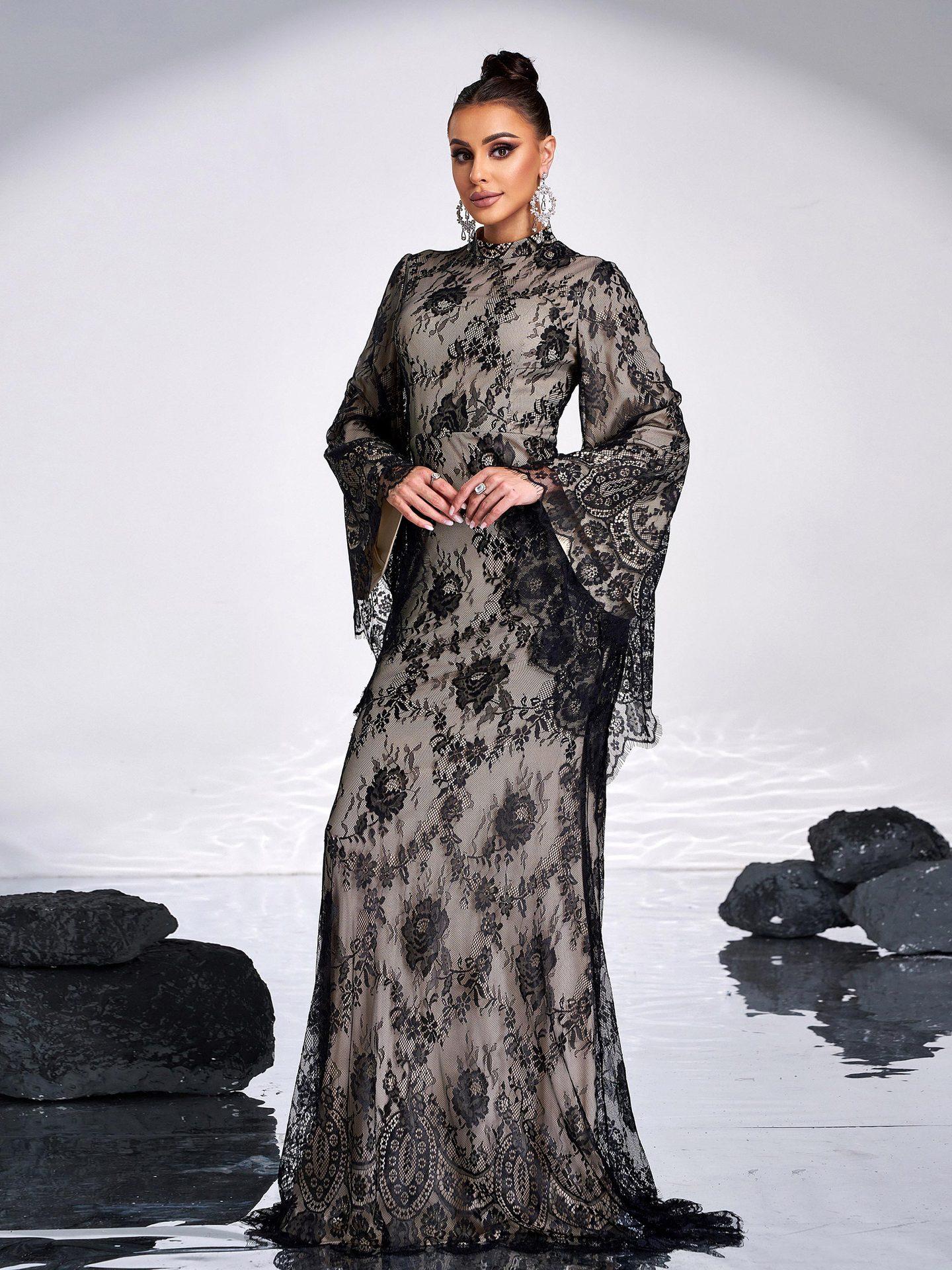 This dress, featuring a round neck and an exquisitely long lace overlay, exudes a seductive charm. Its elegant design highlights the wearer's figure, making it perfect for special occasions or a night out with a loved one.