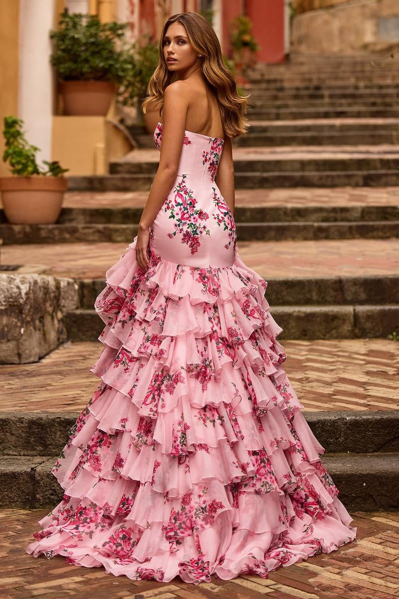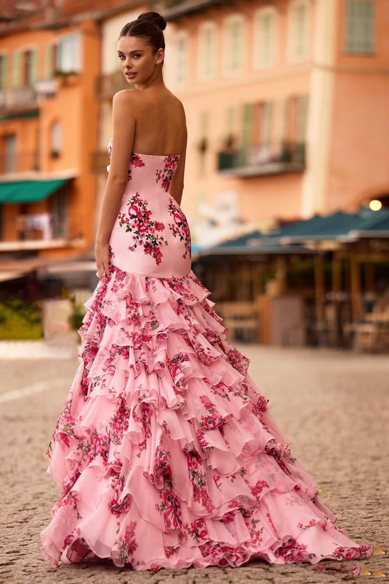 Ruffled Layers and Bow Detail Floral Strapless Gown