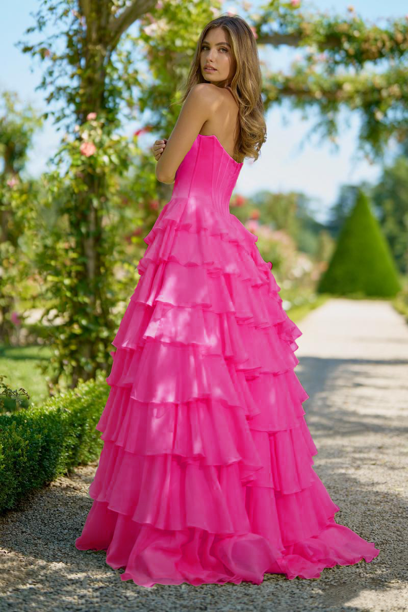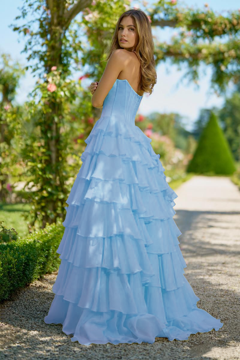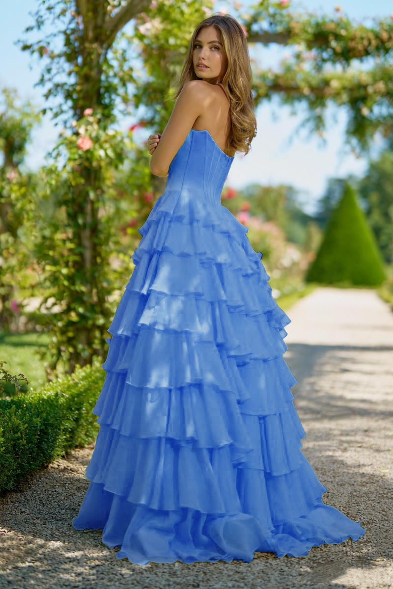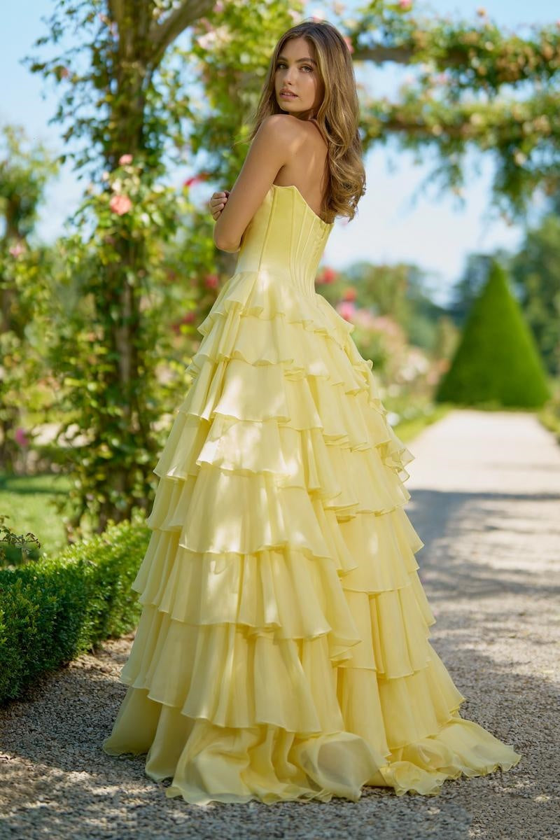 This strapless corset gown is a vision of elegance. The corset bodice, adorned with delicate lace at the neckline, cinches the waist to create a flattering silhouette. Its ruffled layers cascade down in a soft yellow hue, adding movement and volume to the dress. The high slit not only shows a hint of leg but also enhances the gown's allure, making it perfect for formal events like galas or upscale weddings.