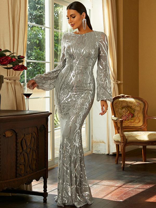 This sequined party runway dress shimmers and shines, turning heads with its dazzling charm. Perfect for a night of glamour, it embodies sophistication and style, ensuring you steal the spotlight on any runway or red carpet.