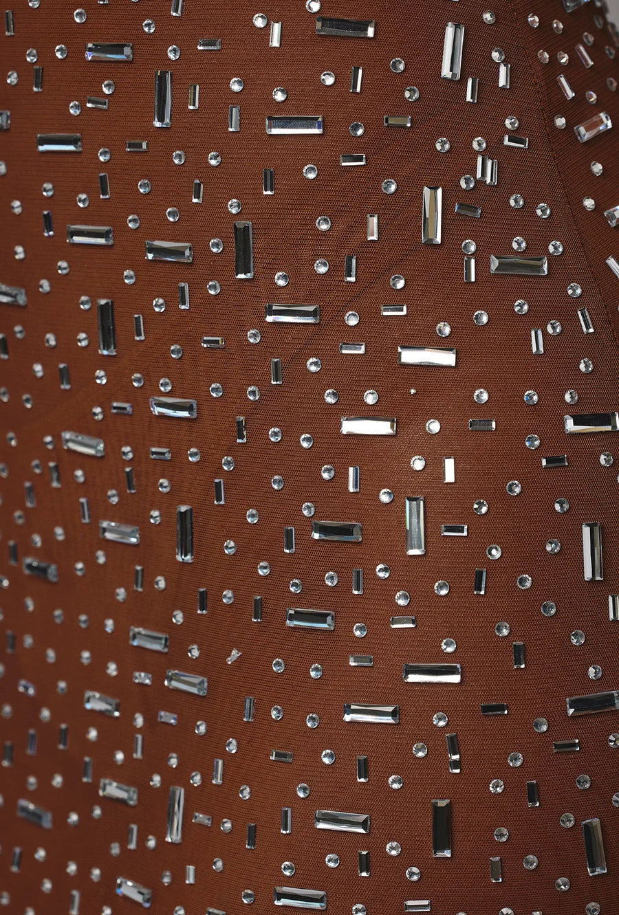 Unforgettable moments call for a stunning evening gown. Add the Isabeau to your nighttime wardrobe with a glamorous sheer evening gown embellished with rhinestone crystals that sparkle in the spotlight.
