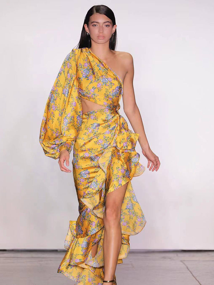 Slant Shoulder Floral Irregular Ruffle Maxi Dress