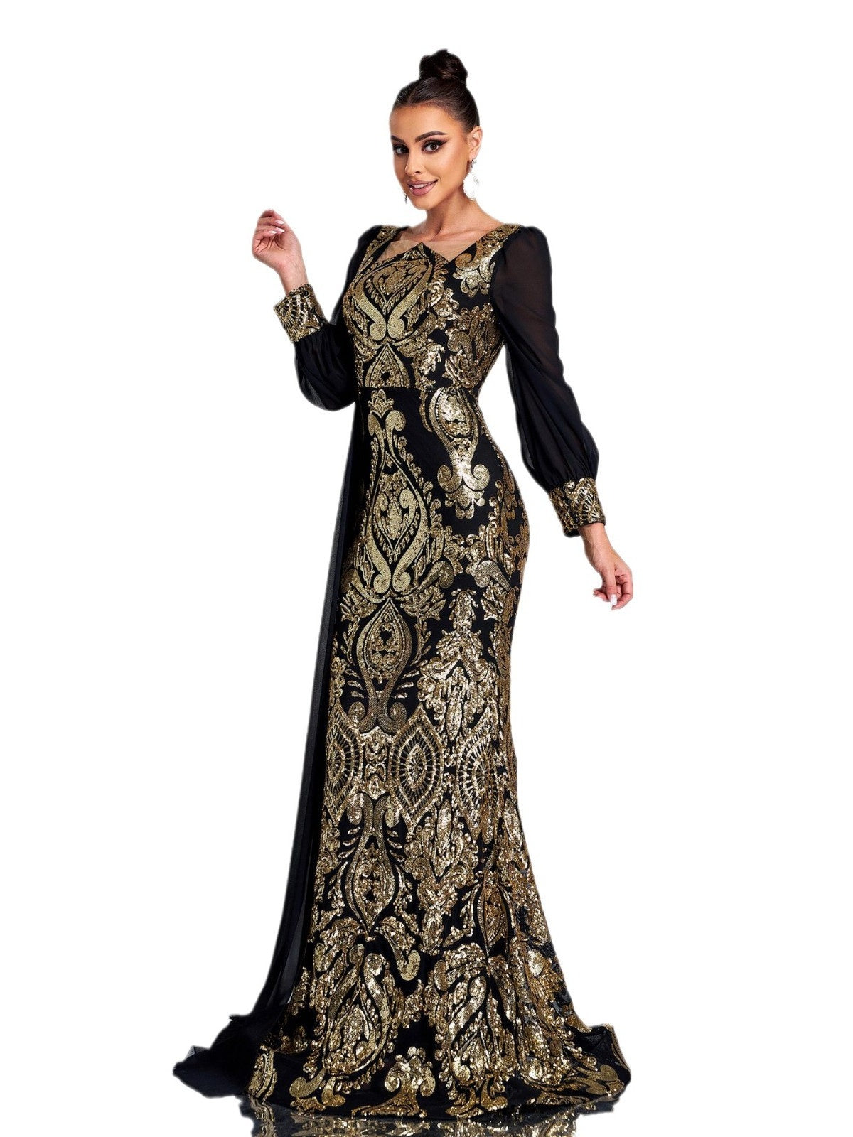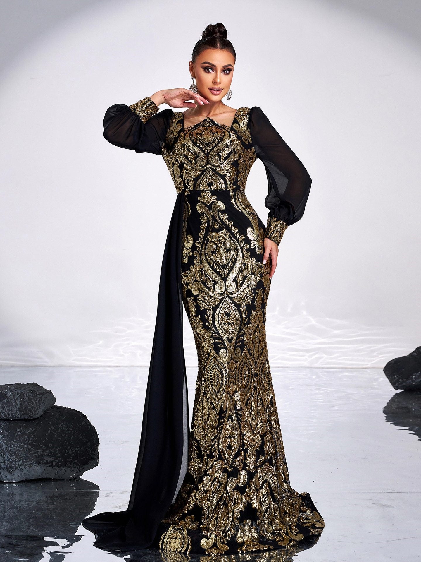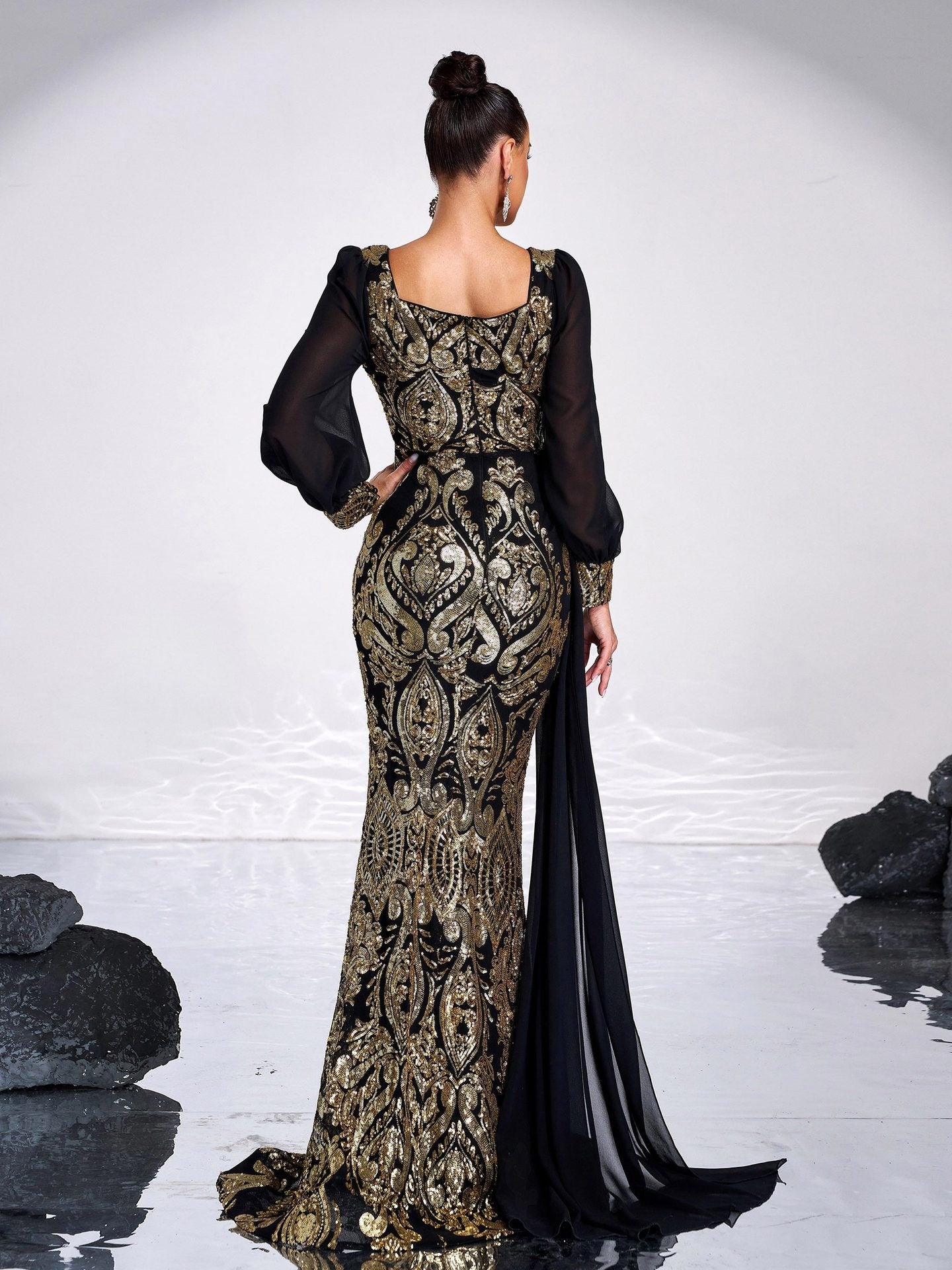 Square Neck Sequin Flowing Ribbon Maxi Dress