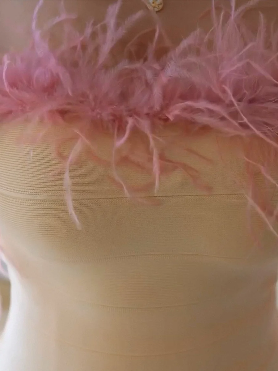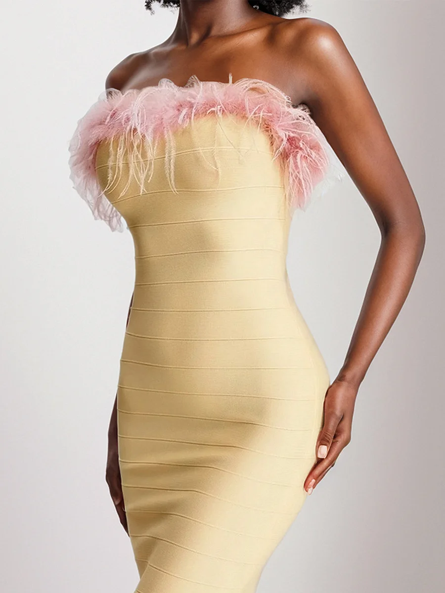 The Strapless Feather Embellished Sexy Bandage Dress is a bold and glamorous choice for any night out. The strapless design accentuates the shoulders and neckline, while the feather embellishments add a playful and dramatic flair. Crafted from bandage material, it hugs your curves beautifully, ensuring a flattering fit. Perfect for parties or special events, this dress is sure to turn heads. Pair it with statement heels and sparkling accessories to complete your stunning look.