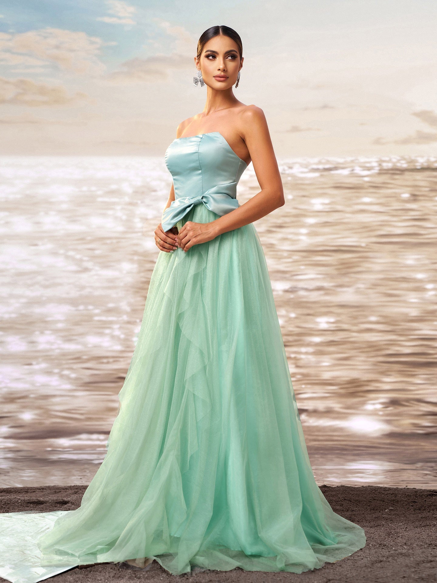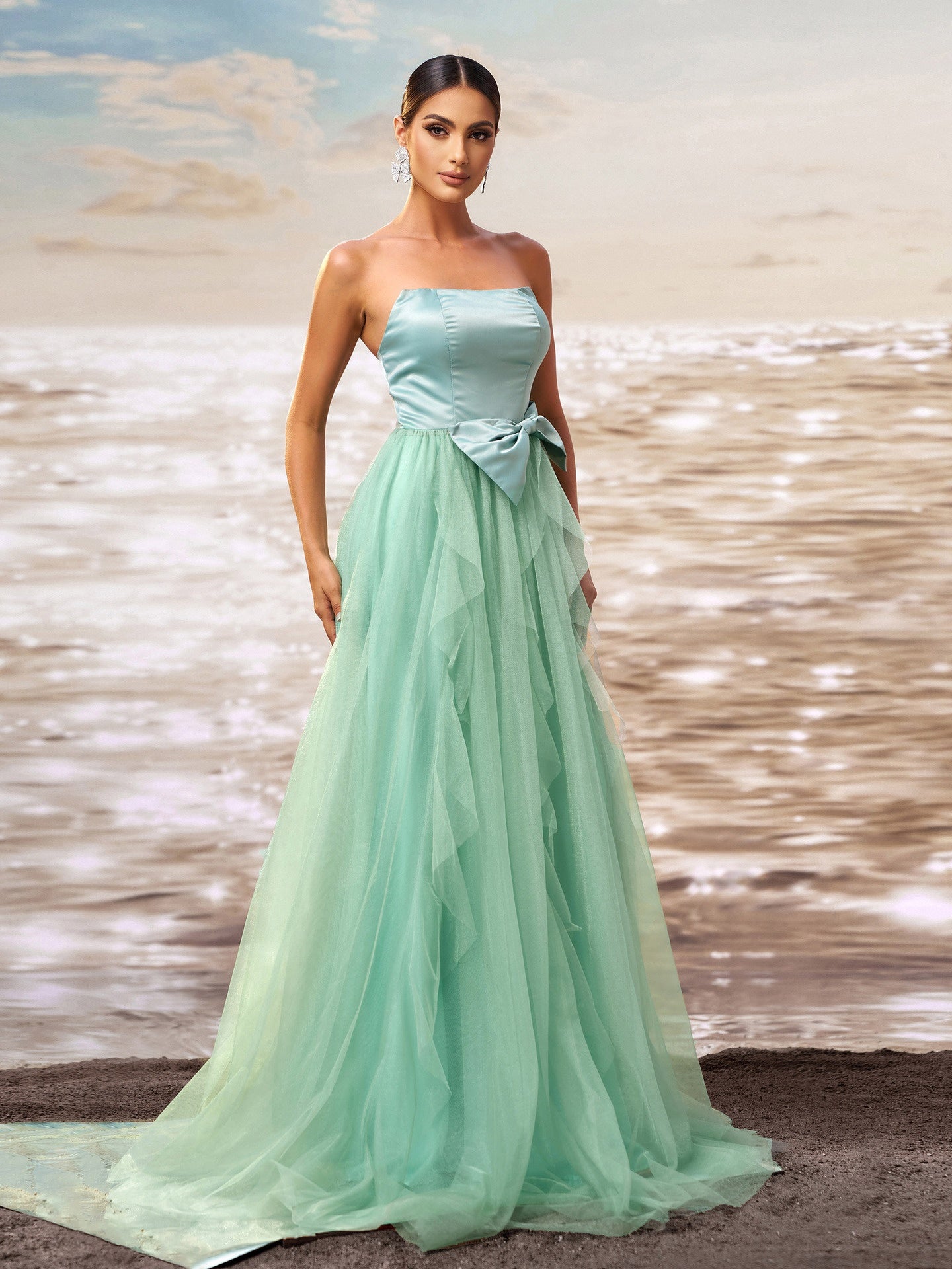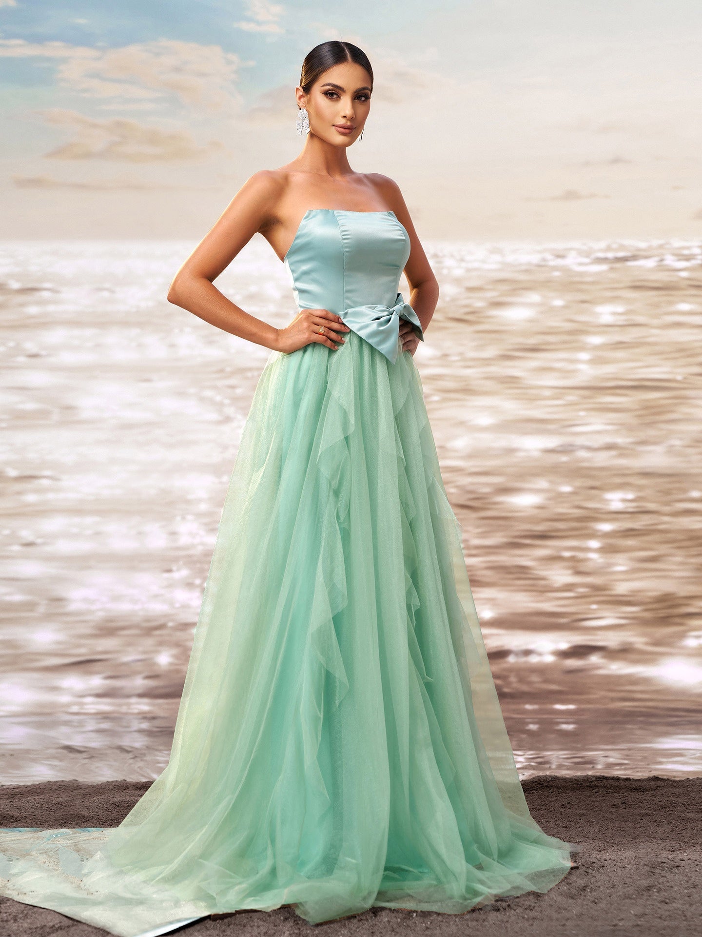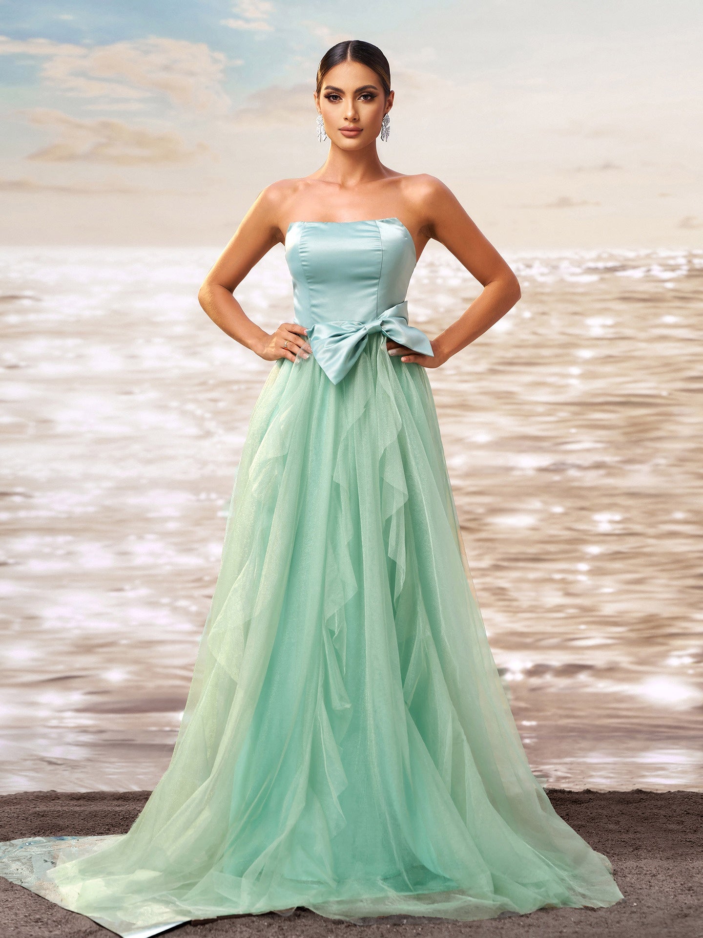 This strapless evening gown is a stunning blend of satin and tulle. The smooth satin bodice offers an elegant look, while the voluminous tulle skirt adds a touch of romance and drama. Ideal for formal events like galas or weddings, it flatters the figure and makes you stand out with its dreamy design.