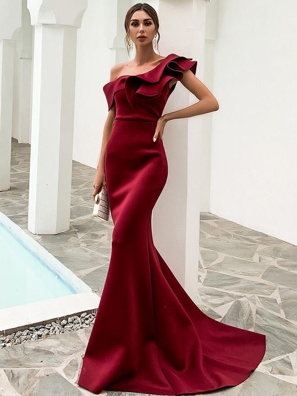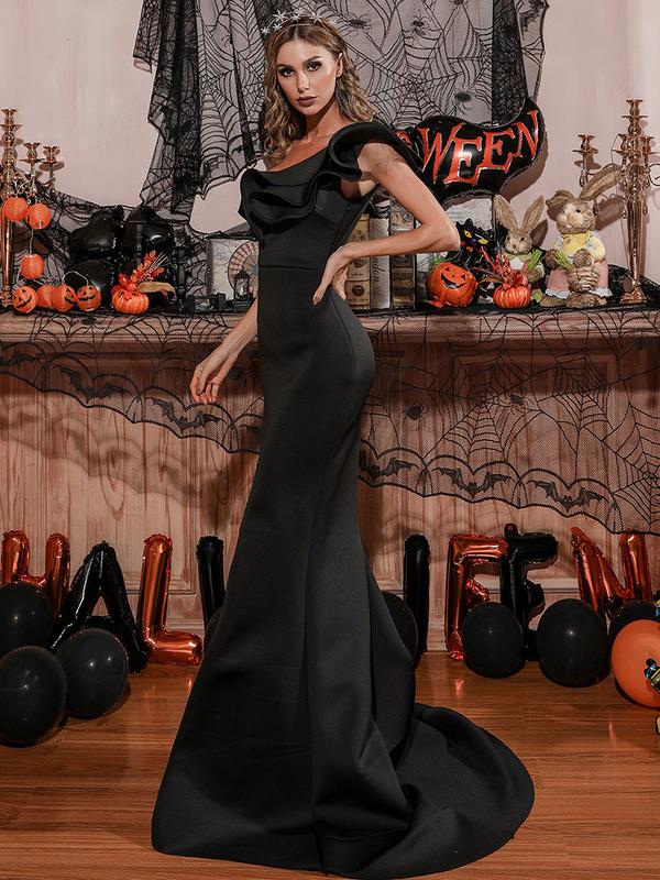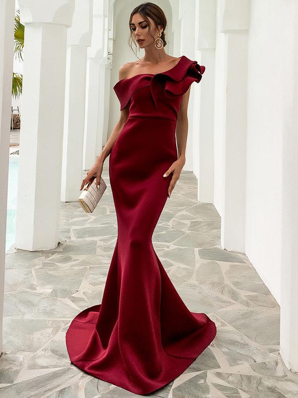 This dress, the Trailing Fishtail Toast, features an elegant fishtail hem that trails gracefully behind, creating a captivating movement. Crafted for a chic and sophisticated look, it's perfect for special occasions.
