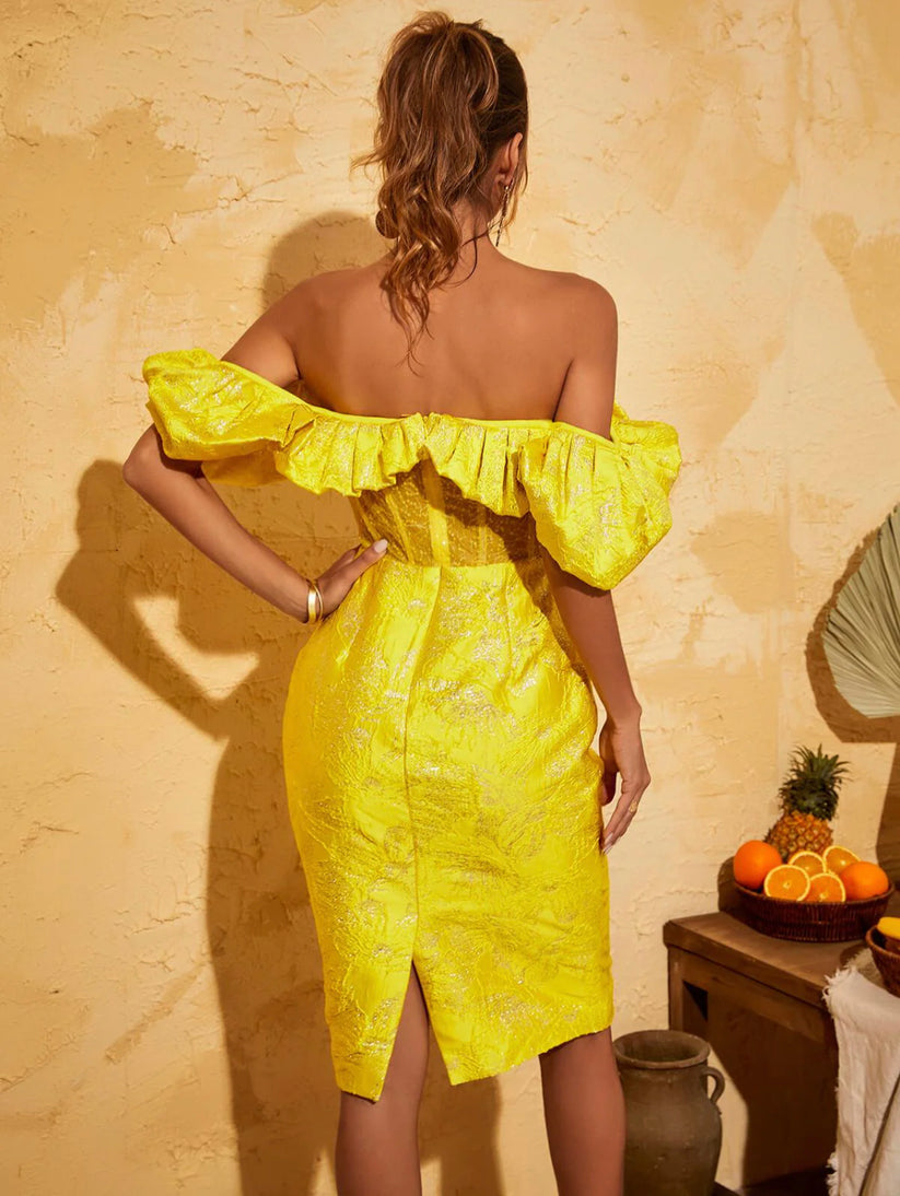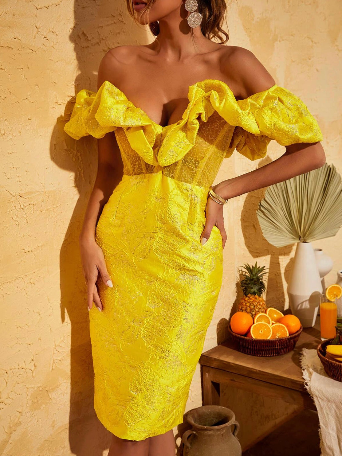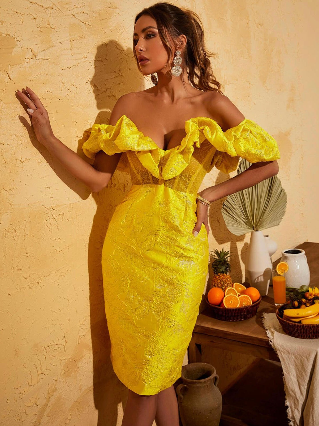 This V-neck backless jacquard wrap midi dress exudes elegance and allure. The V-neckline and backless design offer a touch of sensuality, while the jacquard fabric adds texture and sophistication. With its wrap silhouette, this dress is perfect for special occasions, offering a flattering fit with timeless charm.
