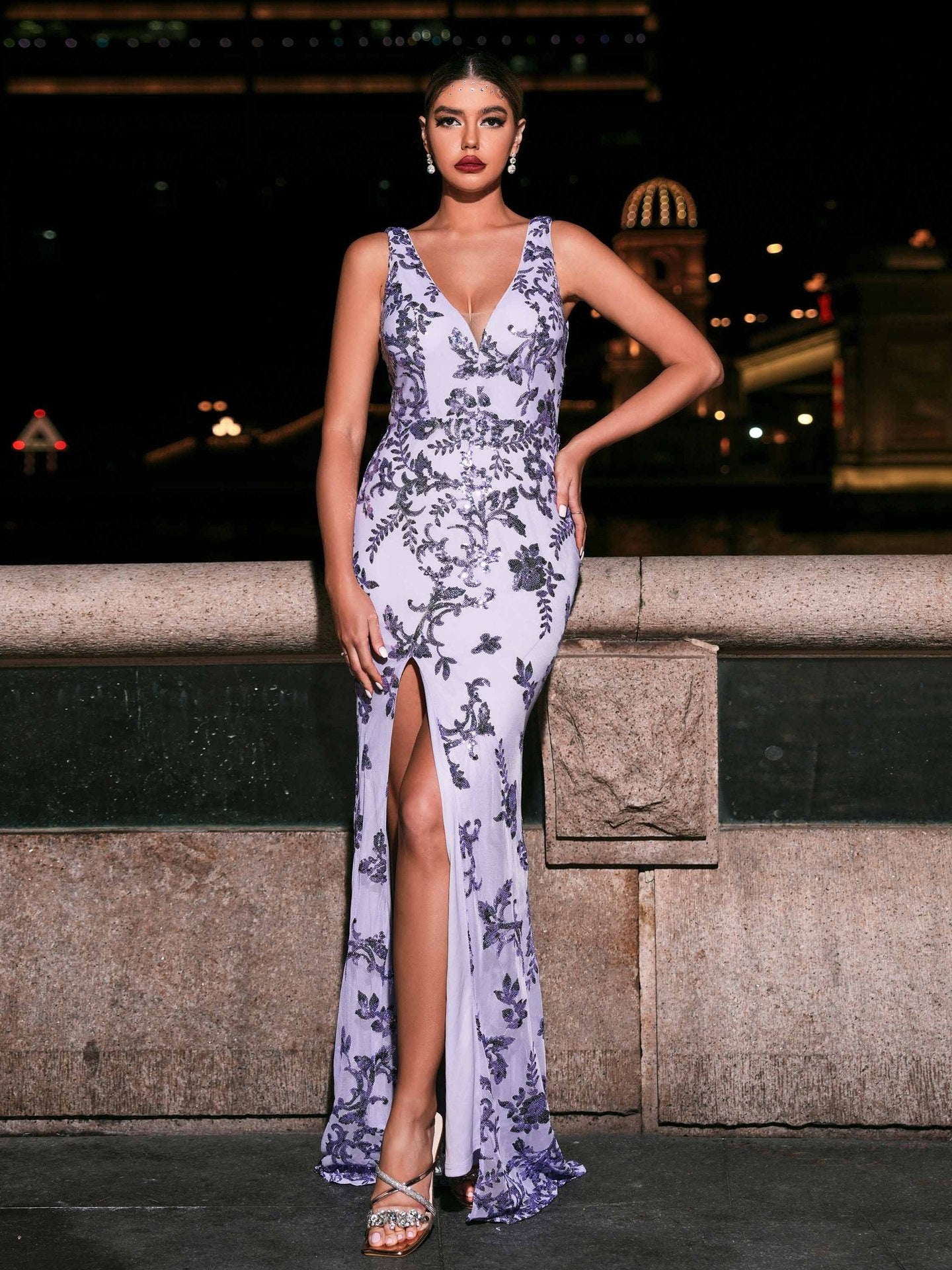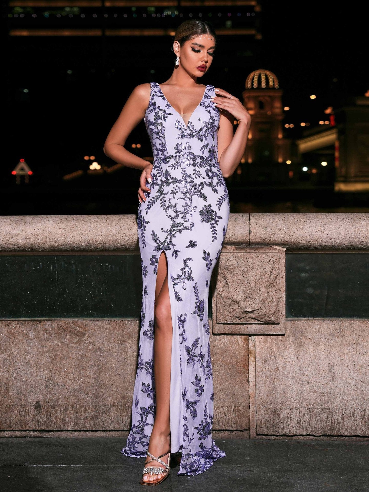 V-Neck Sexy Long Sparkly Evening Fish Tail Maxi Dress