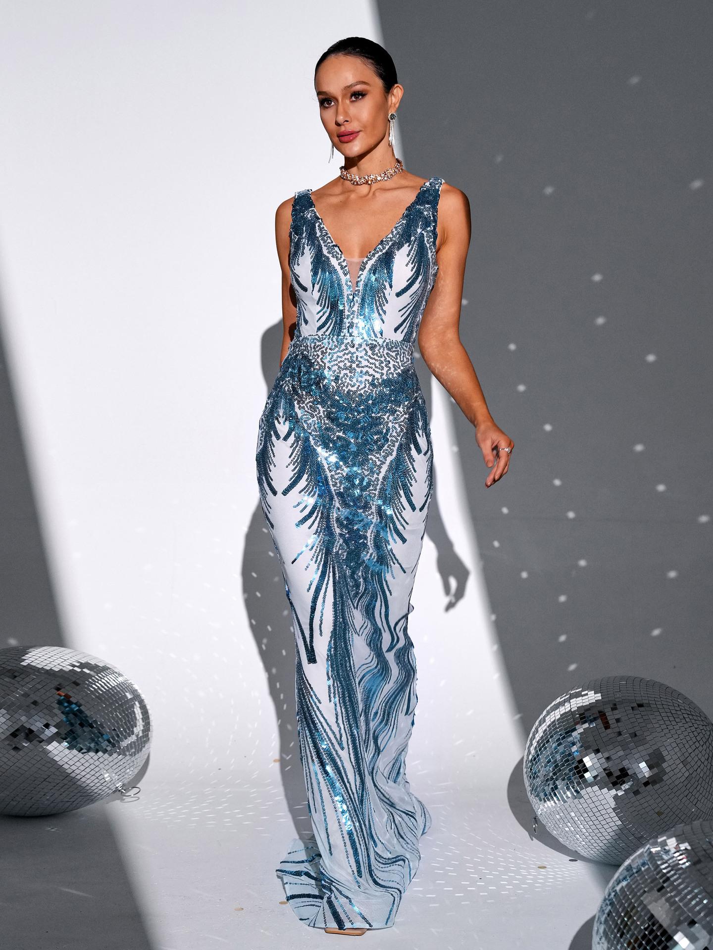 This dress, the V-neck Sexy Sequins Fishtail, is a stunning piece that combines elegance with a bold flair. Featuring a V-neckline and shimmering sequins, it flows gracefully into a fishtail skirt for a figure-hugging, glamorous look.