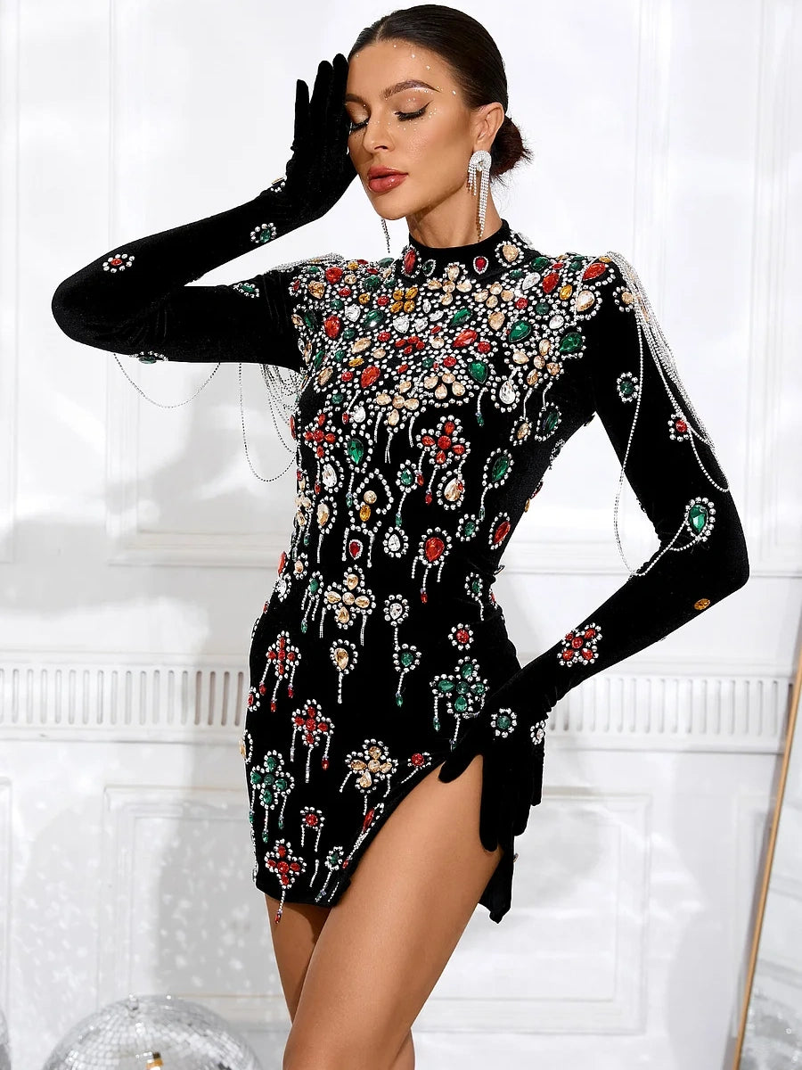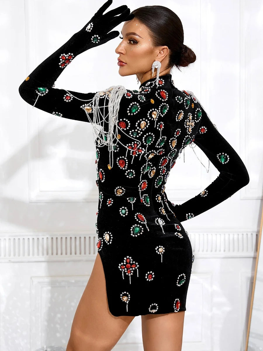 The velvet rhinestone fringe mini dress is a bold statement piece that blends luxury with playful flair. The soft velvet fabric hugs your figure, while sparkling rhinestones and fringed accents create dynamic movement and eye-catching detail. Perfect for parties or nights out, this dress ensures you shine and dance the night away in style.